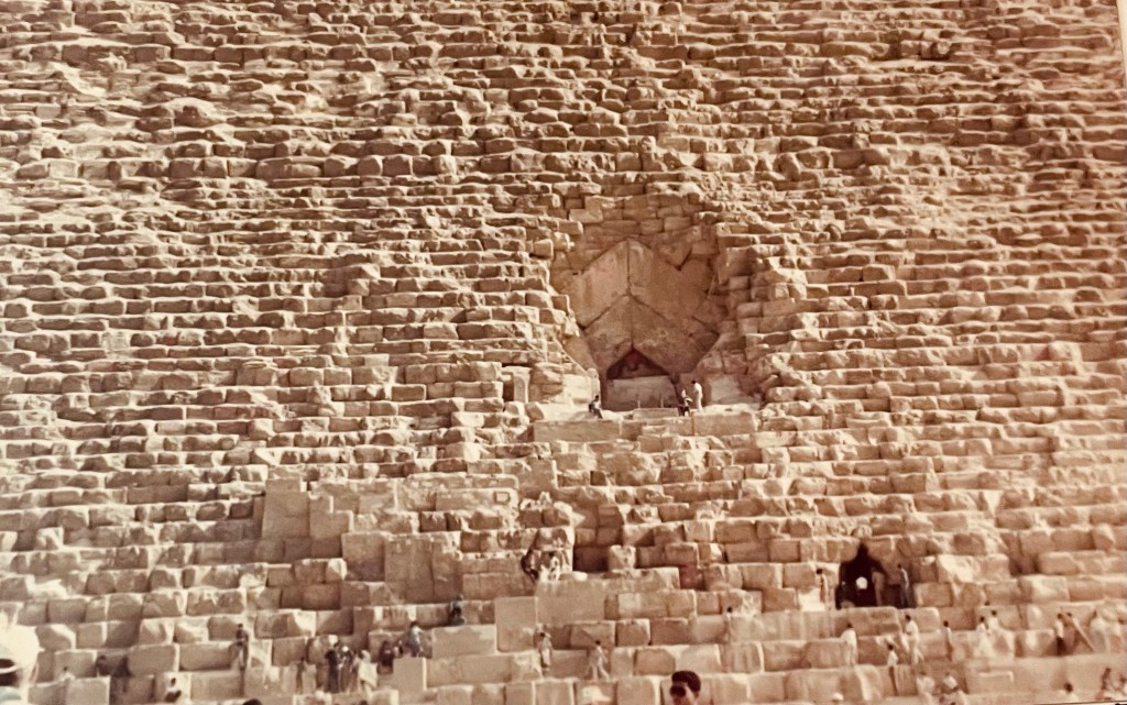 Comme les humains, avec l’âge elles rapetissent : Khéops ne fait plus que 137 m, sa masse de pierres est de plus de 2 millions 500 mille m2, sa superficie de 4 ha, ses quatre faces orientées vers les points cardinaux. Son revêtement de calcaire a été entière pillé par les arabes.