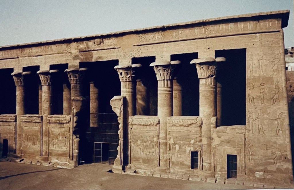 Cette étrange salle à colonnes est tout ce qui a été préservé d’un temple ptolémaïque et fut transformée en église avant que les arabes ne l’habitassent pour finalement l’utiliser en entrepôt pour le coton. C’est ainsi que Champollion le découvrit en 1828.