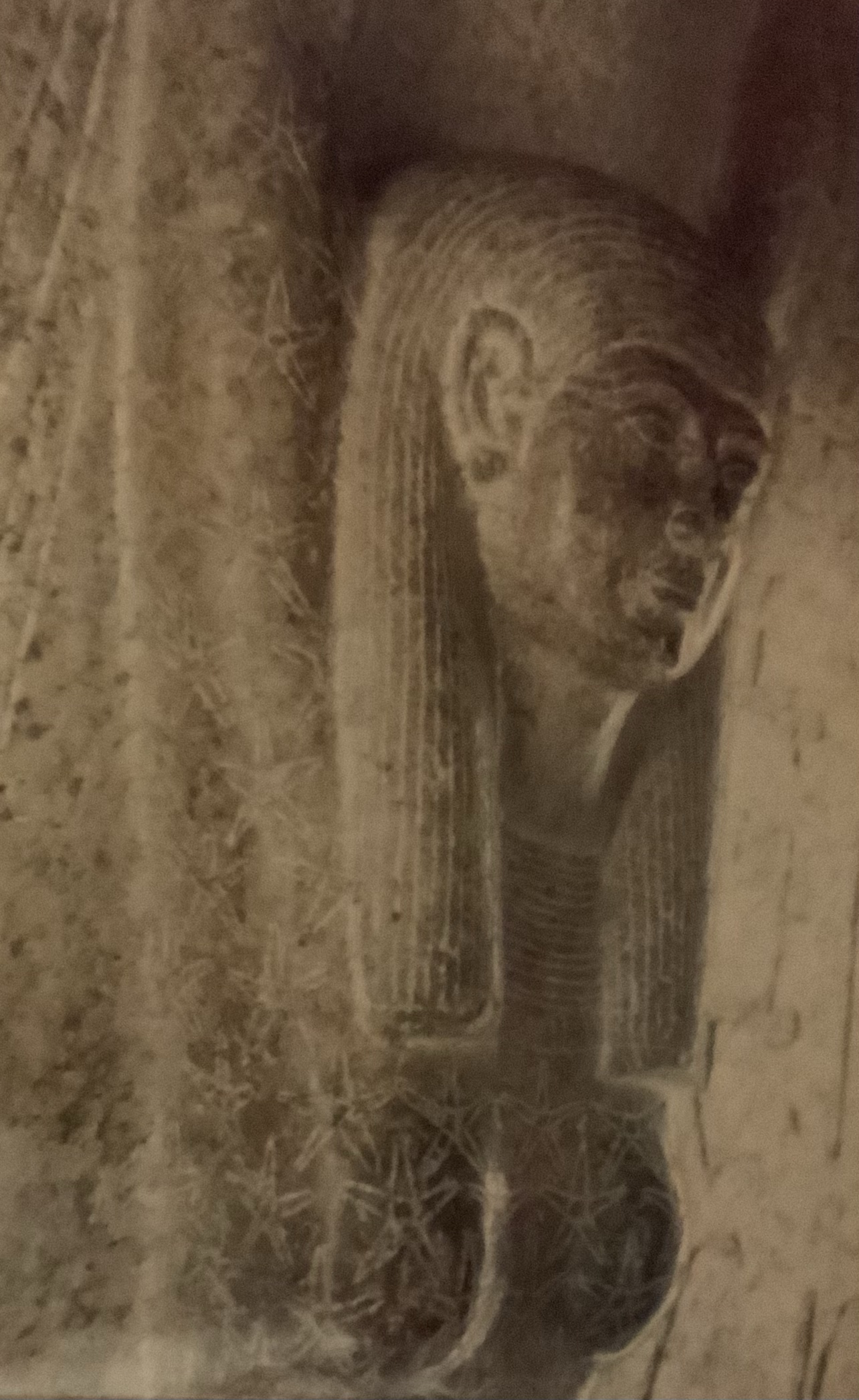 Gravure ptoléméïque jugée par les Égyptiens modernes de décadente (traits moins précis que sous le Moyen Empire : détail des doigts refermés, ventre arrondi, genou arrondi et lourd)