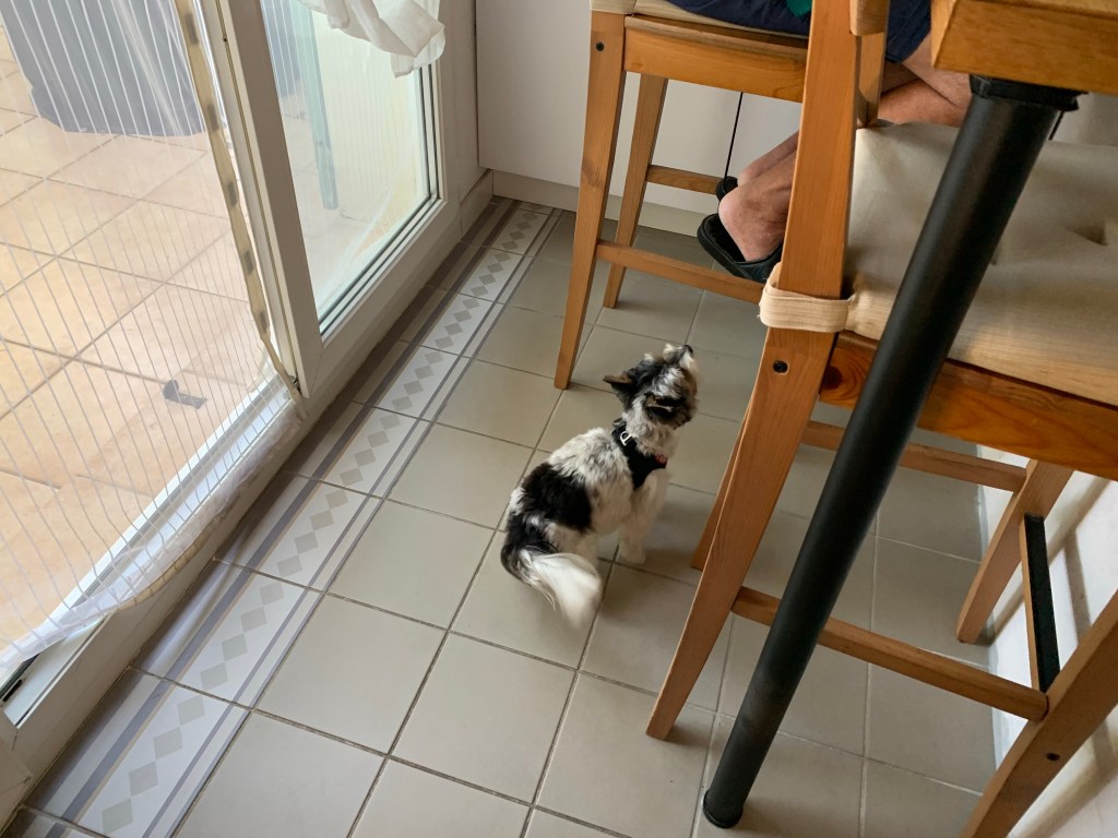 Chloé saute toujours autant pour tenter de pallier sa petite taille, tel un ressort, et sait se faire comprendre pour obtenir l’objet désiré ou comme ici une miette de fromage…