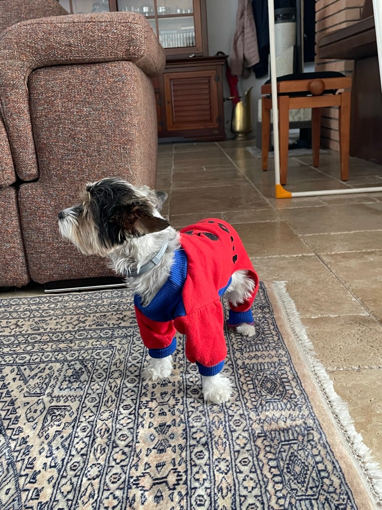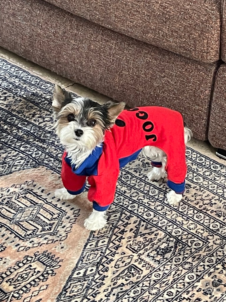 Ce matin séance d’essayage ! J’ai exhumé un jogging acheté pour Joy et Il faut reconnaître qu’il lui va assez bien. Pour l’instant elle a un peu de mal à marcher avec mais je ne désespère pas de partir randonner avec elle bientôt.