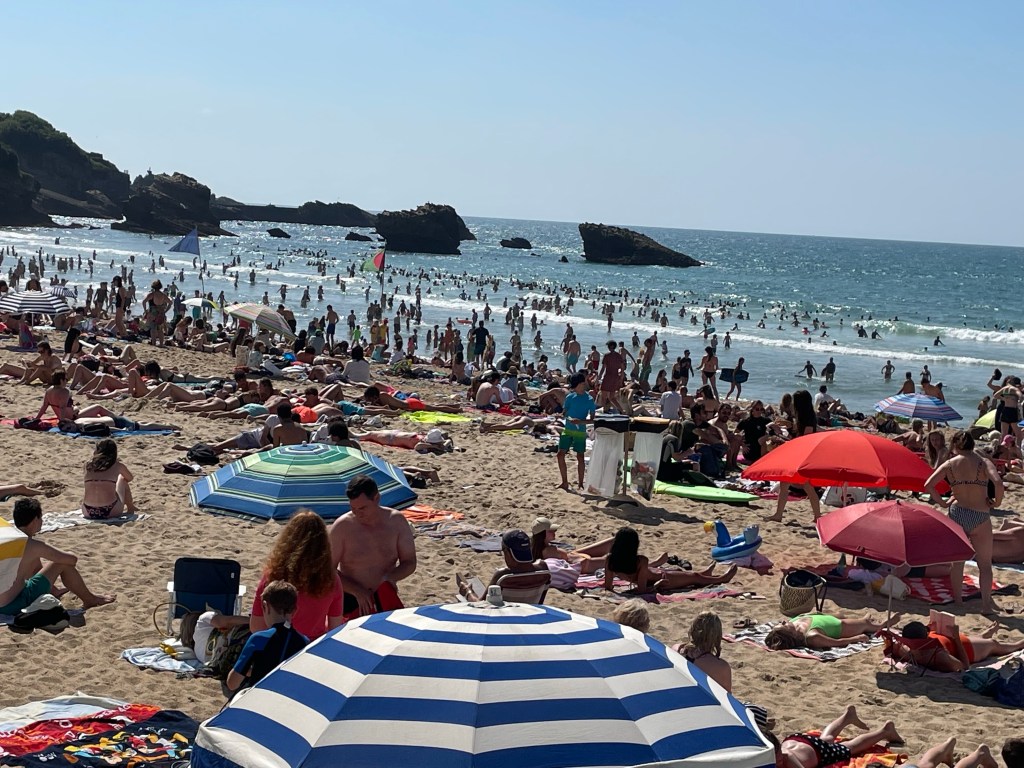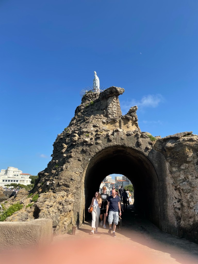 Nous sommes allés ensuite à Biarritz, ville à laquelle nous avions il y a quelques années consacré une semaine cette fois-là en hiver, pour découvrir en été ses plages particulièrement bondées en ces périodes de pandémie et revoir la Vierge au rocher ; le lendemain nous devions rejoindre à Saint Estèphe, le château où se déroulait l’anniversaire de notre cousine.