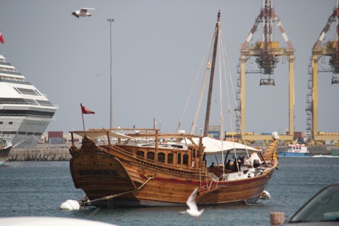 C’est ainsi que nous avons eu la chance de prendre un a320 dont on a appris il y a quelques mois que sa construction serait désormais arrêtée, donc appelé à disparaître*. Le voyage s’est déroulé dans des conditions beaucoup plus agréables que sur unAirbus plus modeste en classe touriste. Si à l’aller nous avons pu avoir Air France avec un repas plutôt raffiné, au retour avec Vols Emirates, les conditions étaient nettement moins avantageuses (le repas était plus que médiocre notamment). Arrivés à Dubaï nous avons été installés sur notre bateau pour partir immédiatement de nuit en direction d’Oman, puisque c’était le départ du circuit.