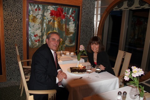 C’était le 6 mars, jour anniversaire de notre mariage, et nous avons eu, de retour au bateau, droit dans notre restau gastronomique (nous avions gardé notre option vip) à un gâteau servi en grandes pompes par l’adorable personnel de ce restaurant.