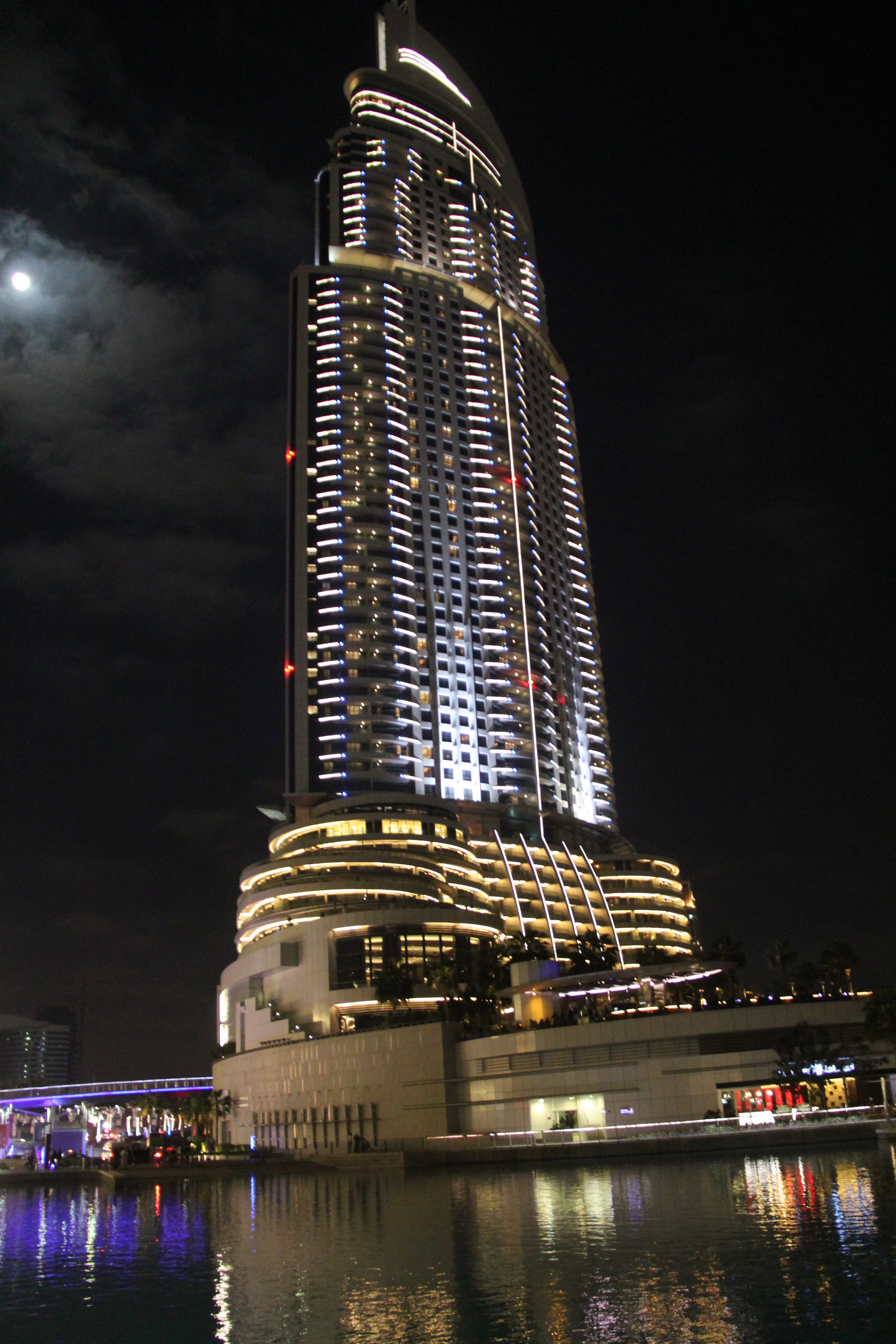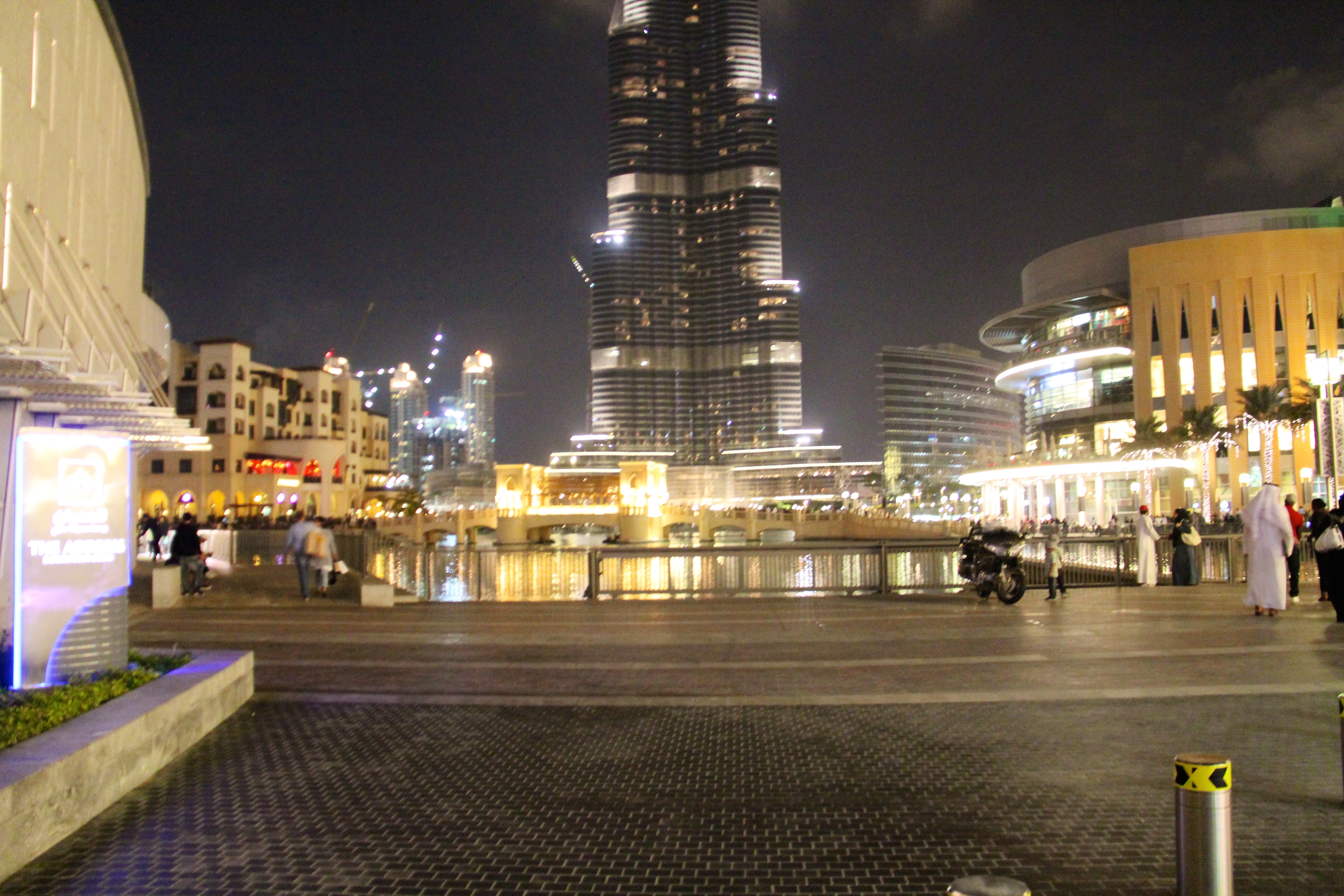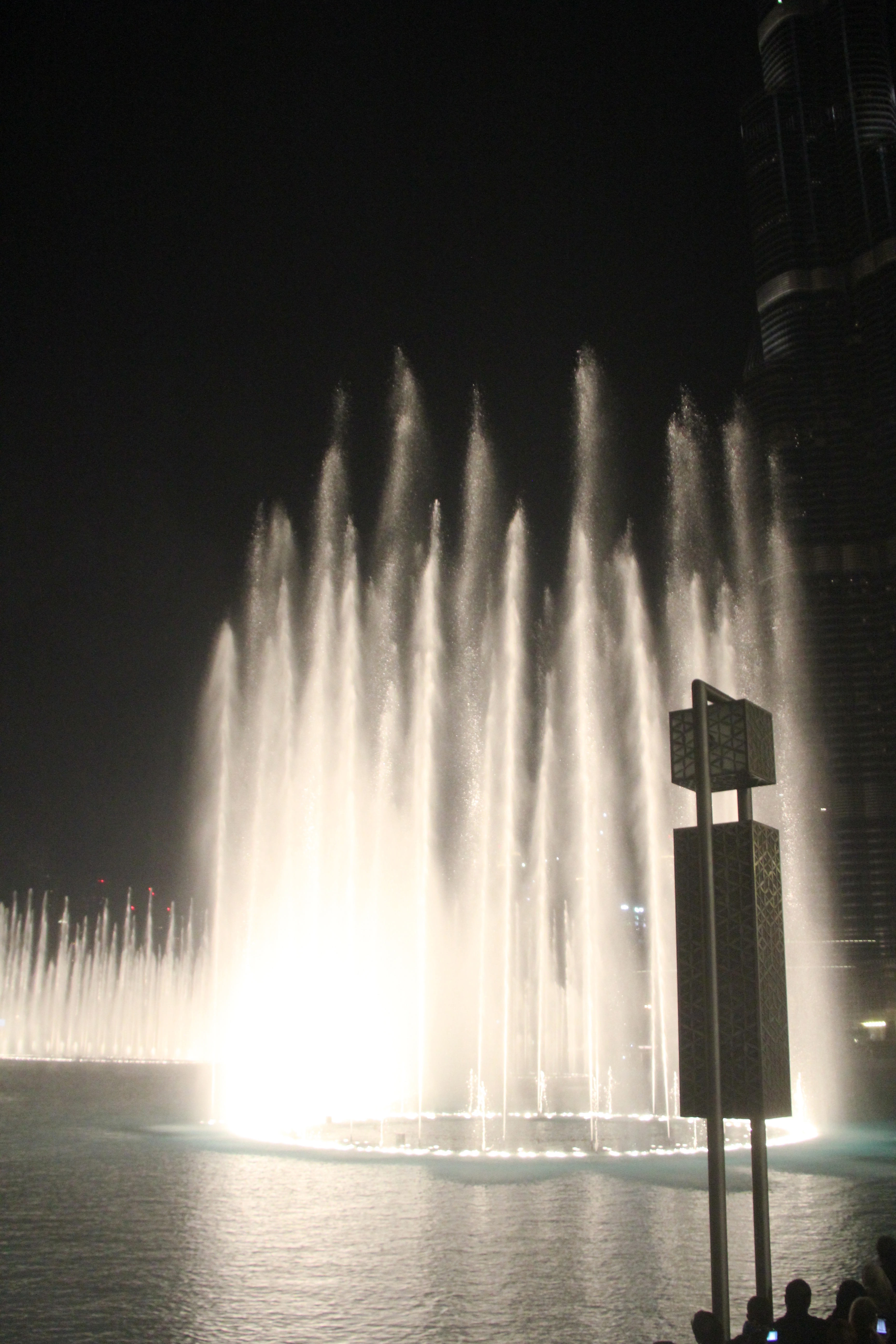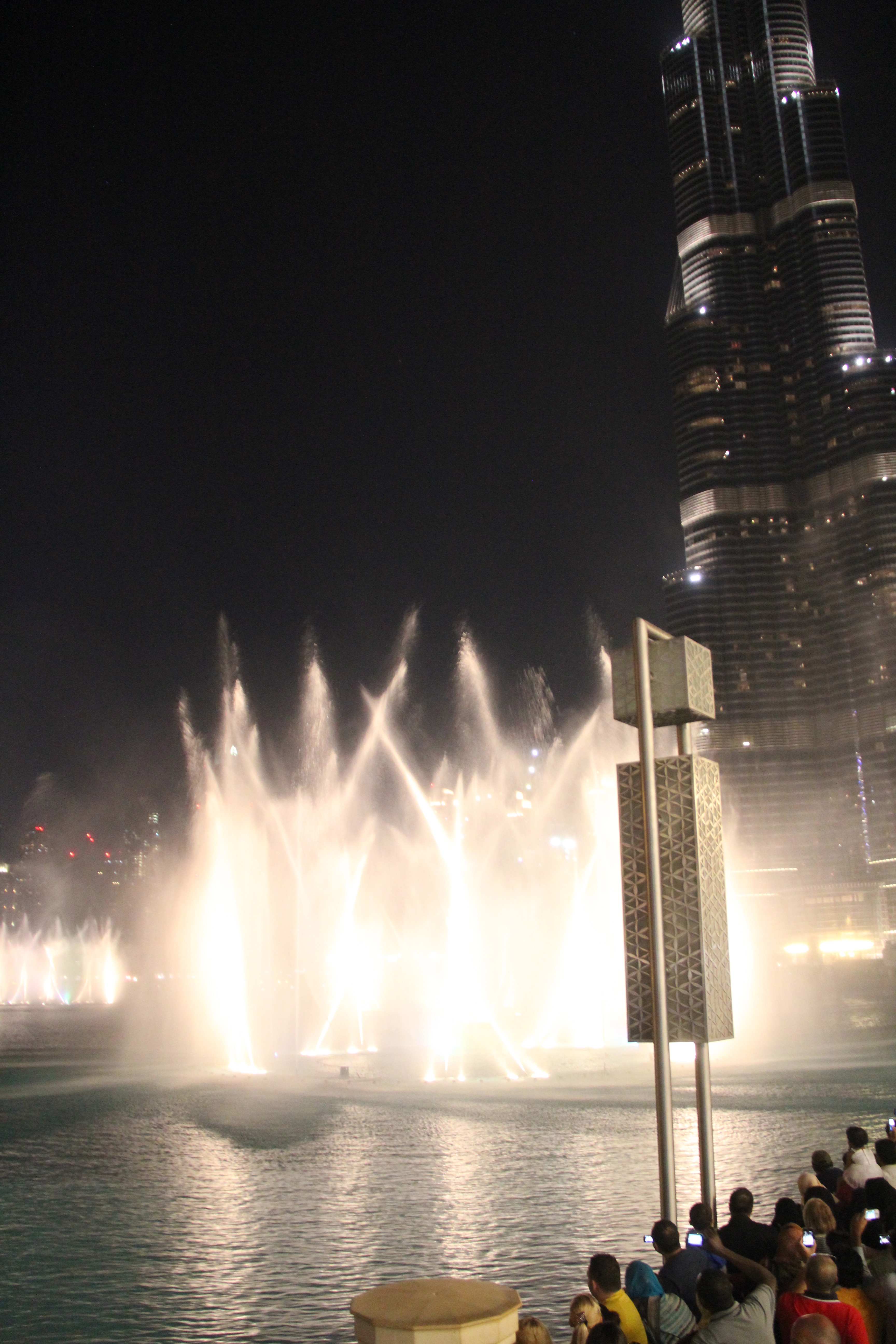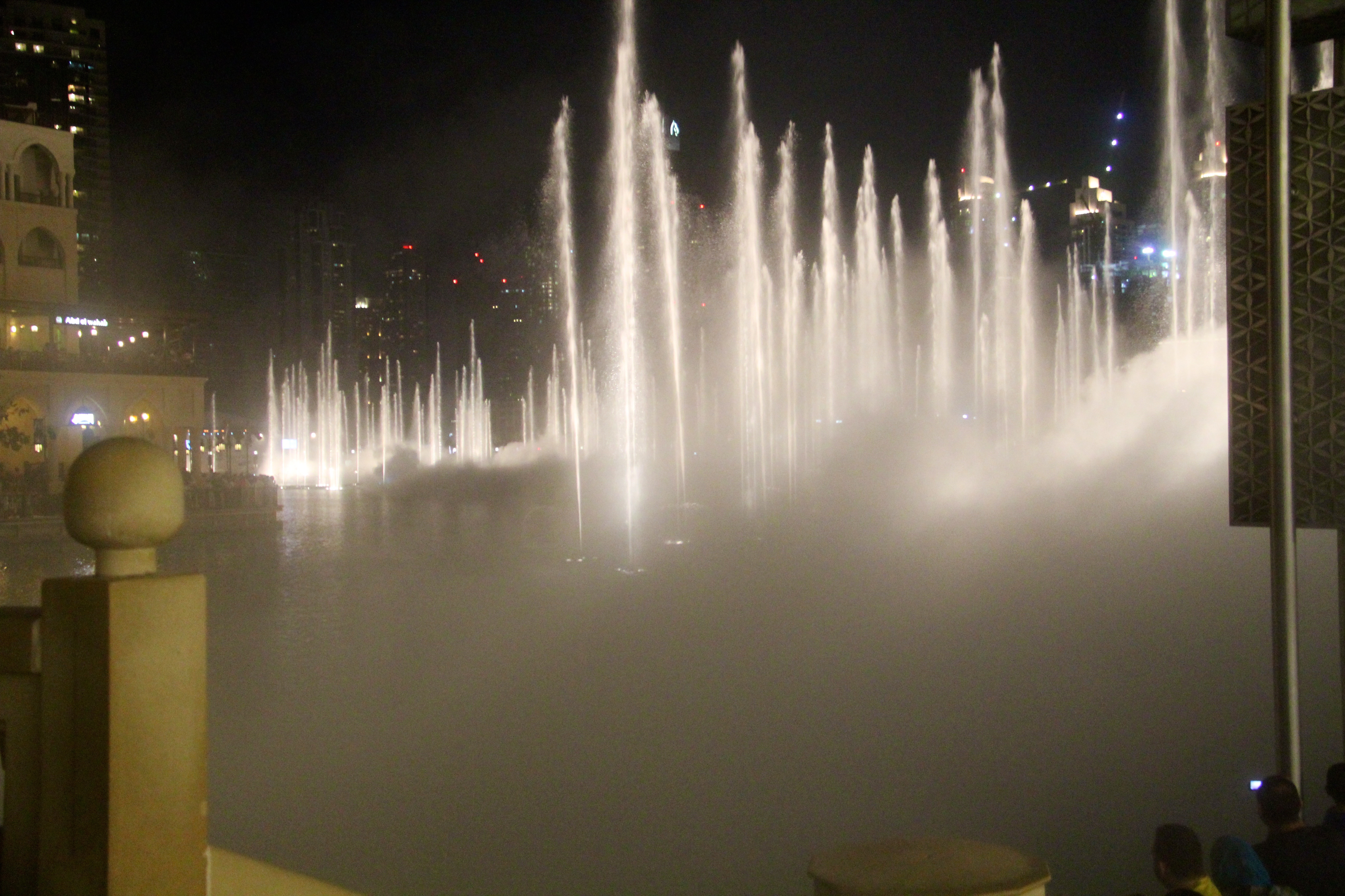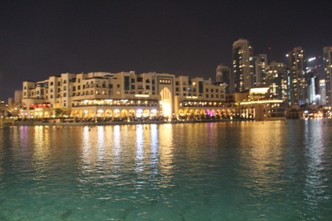Un soir une excursion nous a permis en prenant le bus d’aller s’imprégner de Dubaï by night et se régaler du spectacle offert par le ballet de Dubaï Fontaine (sur une musique ce soir-la de Michel Jackson) aux jets immenses ; ces fontaines se trouvent au pied de Burj Khalifa. Entendons-nous, cela s’est borné à une visite à pied de ce que nous avions vu en journée mais le spectacle des fontaines est vraiment extraordinaire – comme tout ce qui se passe à Dubaï. Un aperçu ci-dessous en donnera une idée.