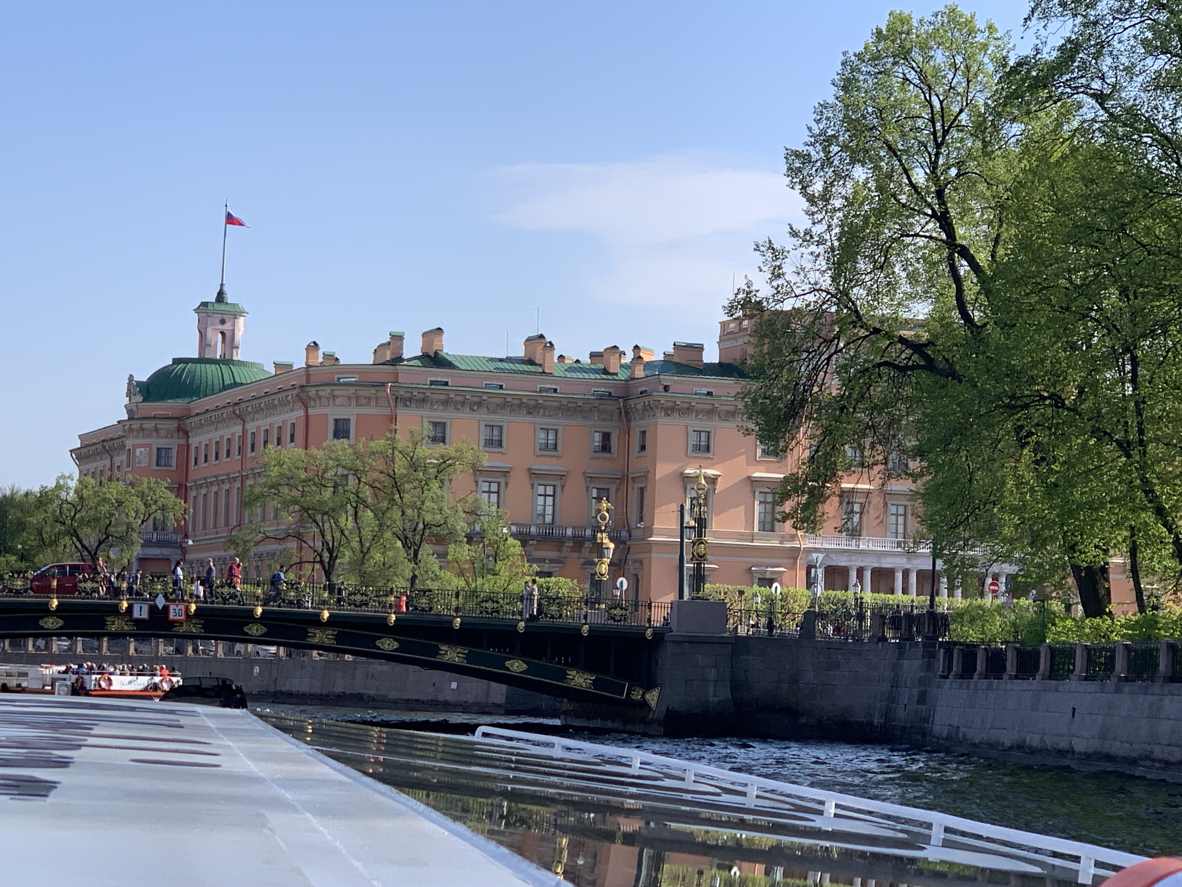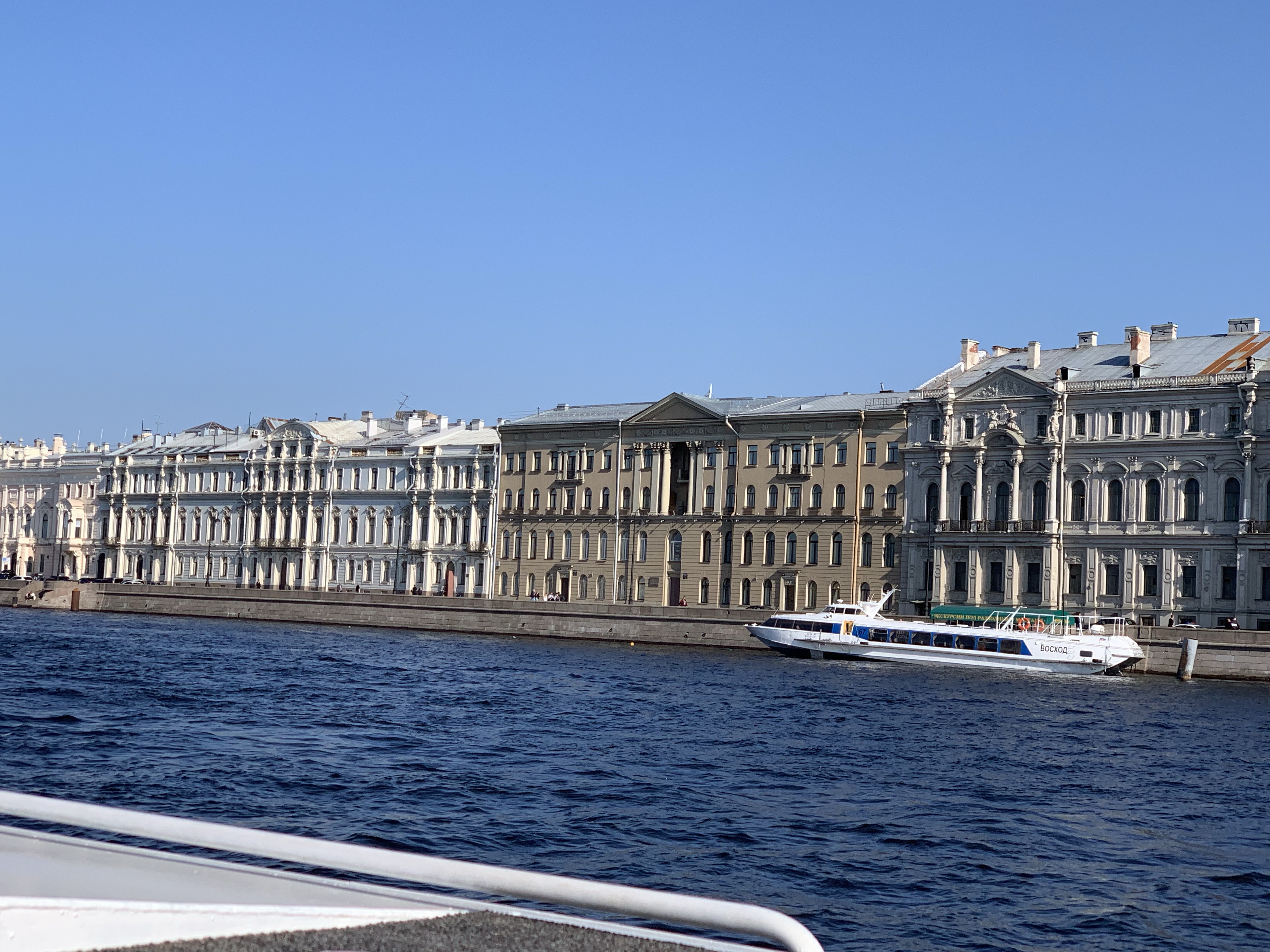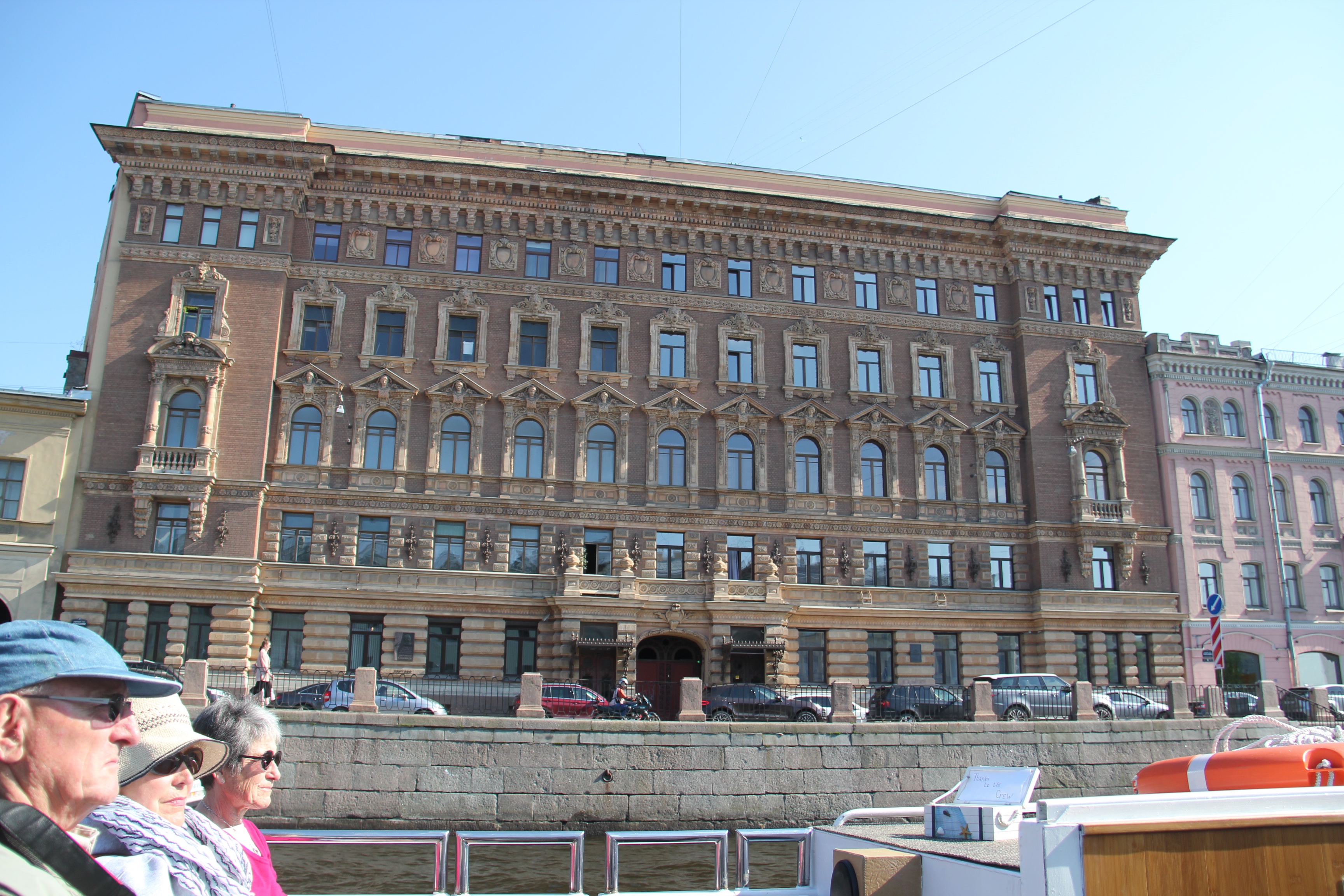 Après le déjeuner au restaurant Moscou, nous avons pris le bateau pour sillonner les canaux de la ville et avoir depuis la Neva une autre perspective des bâtiments la côtoyant. Nous avons pris beaucoup de plaisir à voir un jeune nous faire des signes depuis les ponts pour nous faire comprendre que nous le retrouverions au pont suivant et à notre grand amusement de pont en pont nous l’avons retrouvé. En le récompensant nous avons compris qu’étudiant, il se faisait ainsi un peu d’argent de poche.