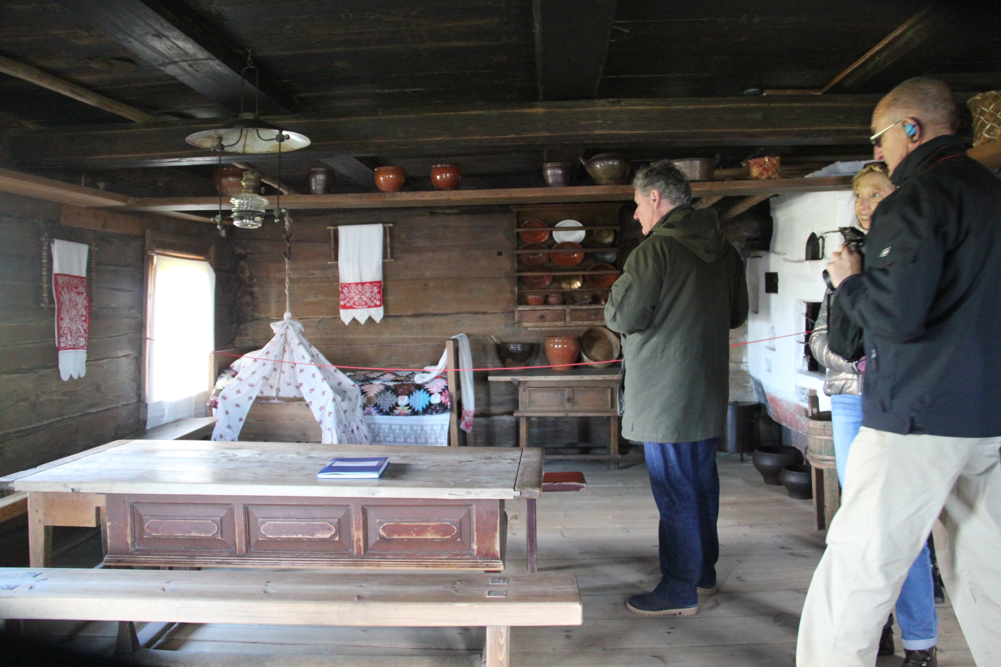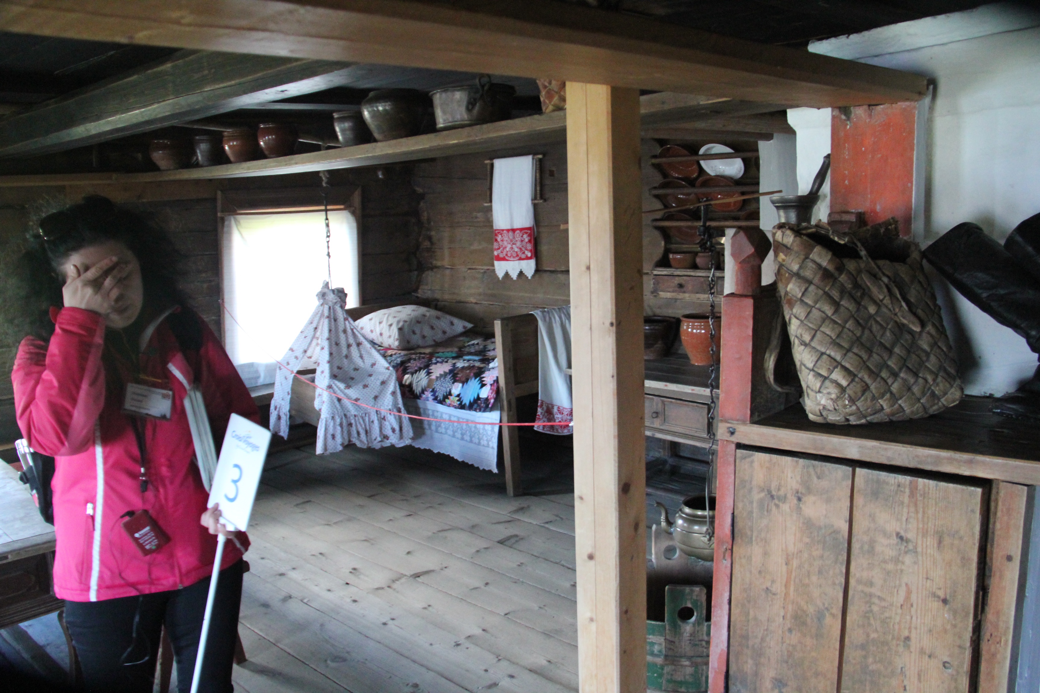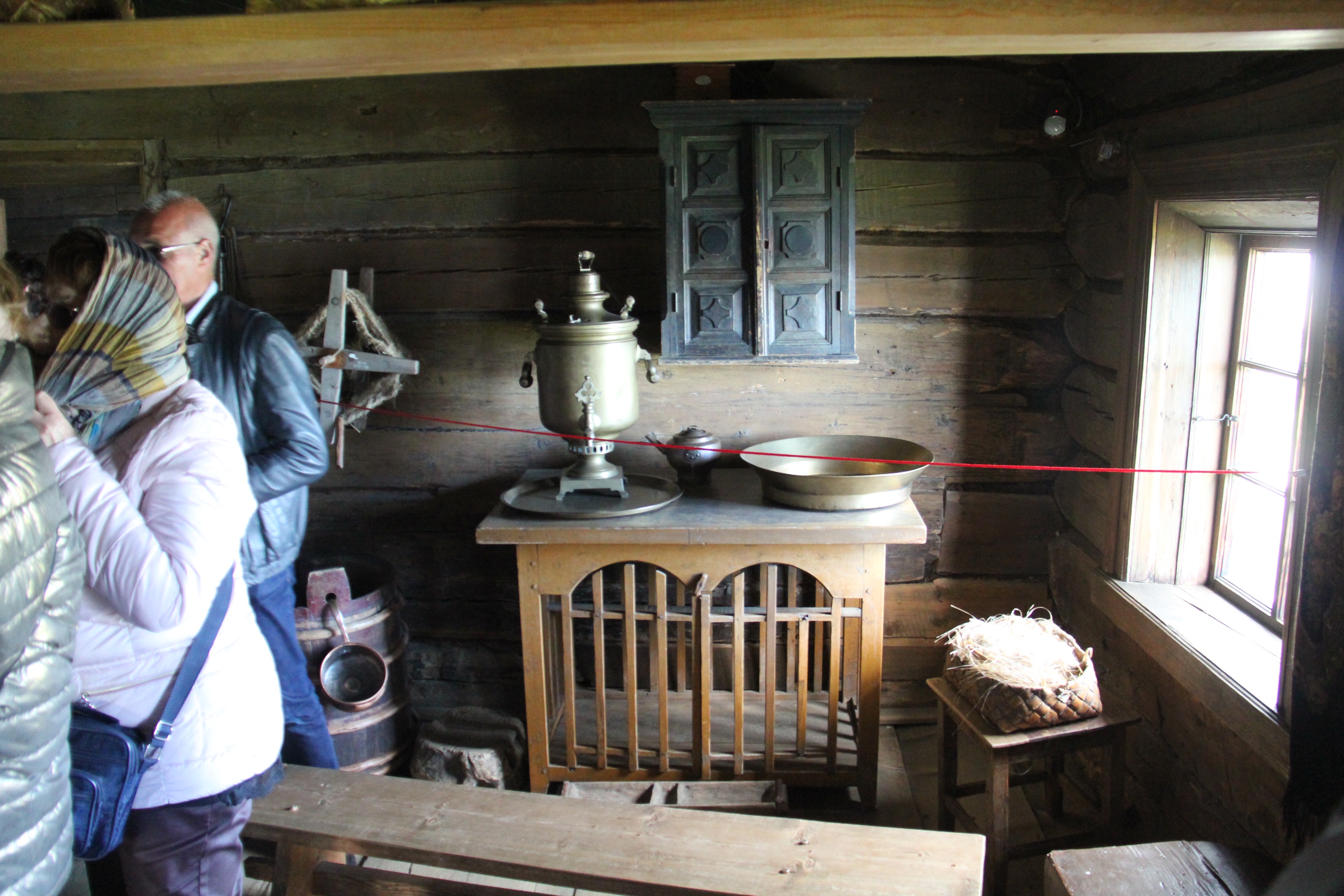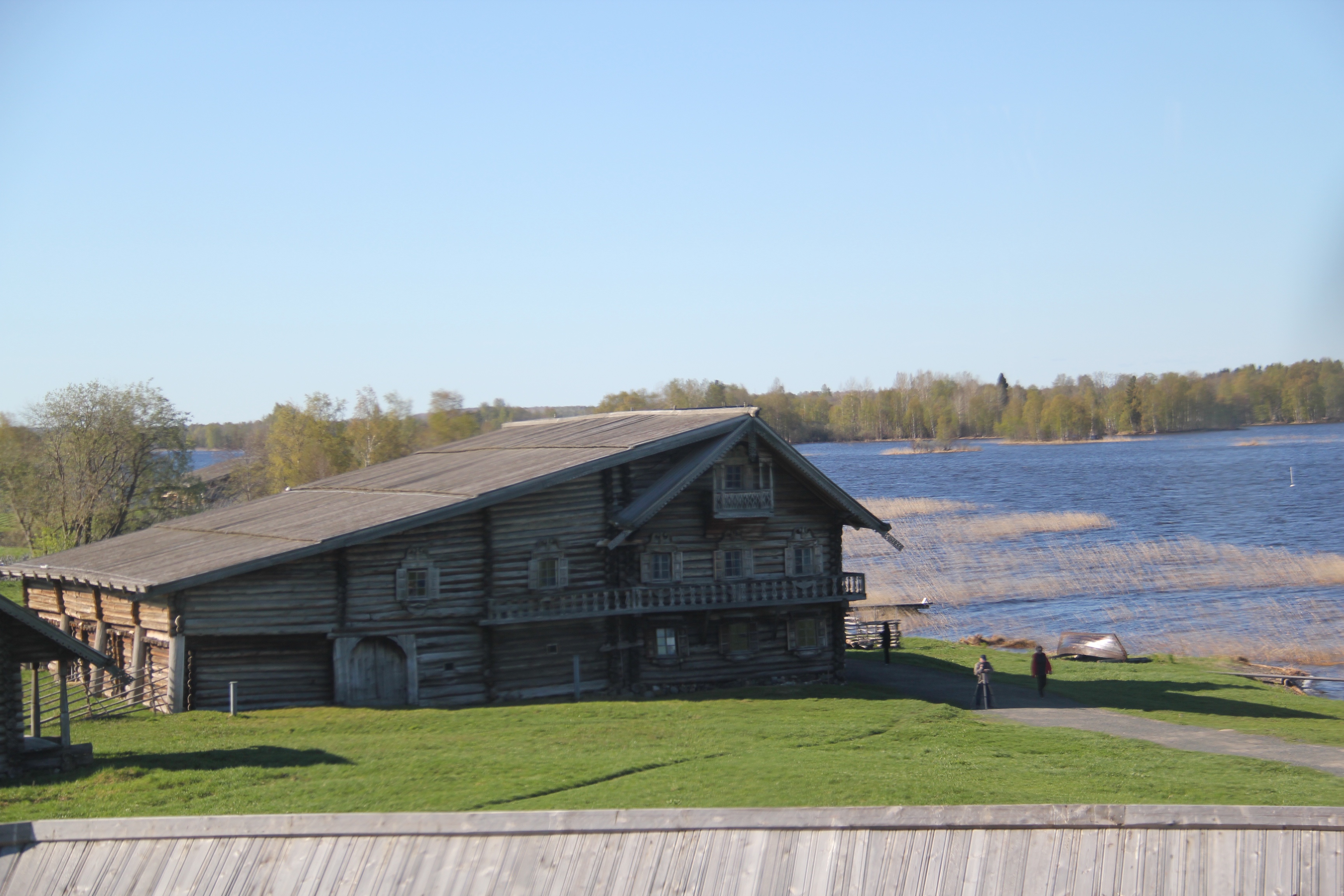 Après une matinée passée à bord entre gym matinale et réunion sur la vie à bord et la description des escales nous voici à MANDROGUI où MANDROGA, village en bois construit par des enthousiastes amoureux de la vie paysanne et où nous avions prévu de prendre un déjeuner typique. Dès l’accostage on est charmé par ces maisons en bois, constructions assez récentes rappelant la vie d’autrefois en Russie. Sur la rive déserte du Svir, à la place d’un village disparu pendant la guerre, ils ont construit ces isbas et un débarcadère. Les maisons sont richement décorées, notamment le restaurant où nous prenons notre repas dont l’intérieur évoque les anciens terems russes, ces ensembles de pièces d’habitation situées à l’étage supérieur, repas délicieux arrosé de vodka (modérément) et de thé préparé à la russe et accompagné d’un musicien et de ses chanteuses.