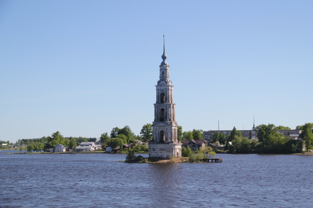 Vers 15 h nous passons devant l’église engloutie de Kaliazine : Surnommée l’Atlantide russe, elle est célèbre grâce à son étonnant clocher, seul vestige de l’église Saint Nicolas submergée au XXe siècle. Staline, après avoir fait raser les bâtiments conventuels, ordonne ensuite la construction d’un immense barrage qui provoquera la submersion totale de l’île lors de sa mise en eau en 1940, après avoir tout de même fait transférer les habitants sur un site plus élevé !