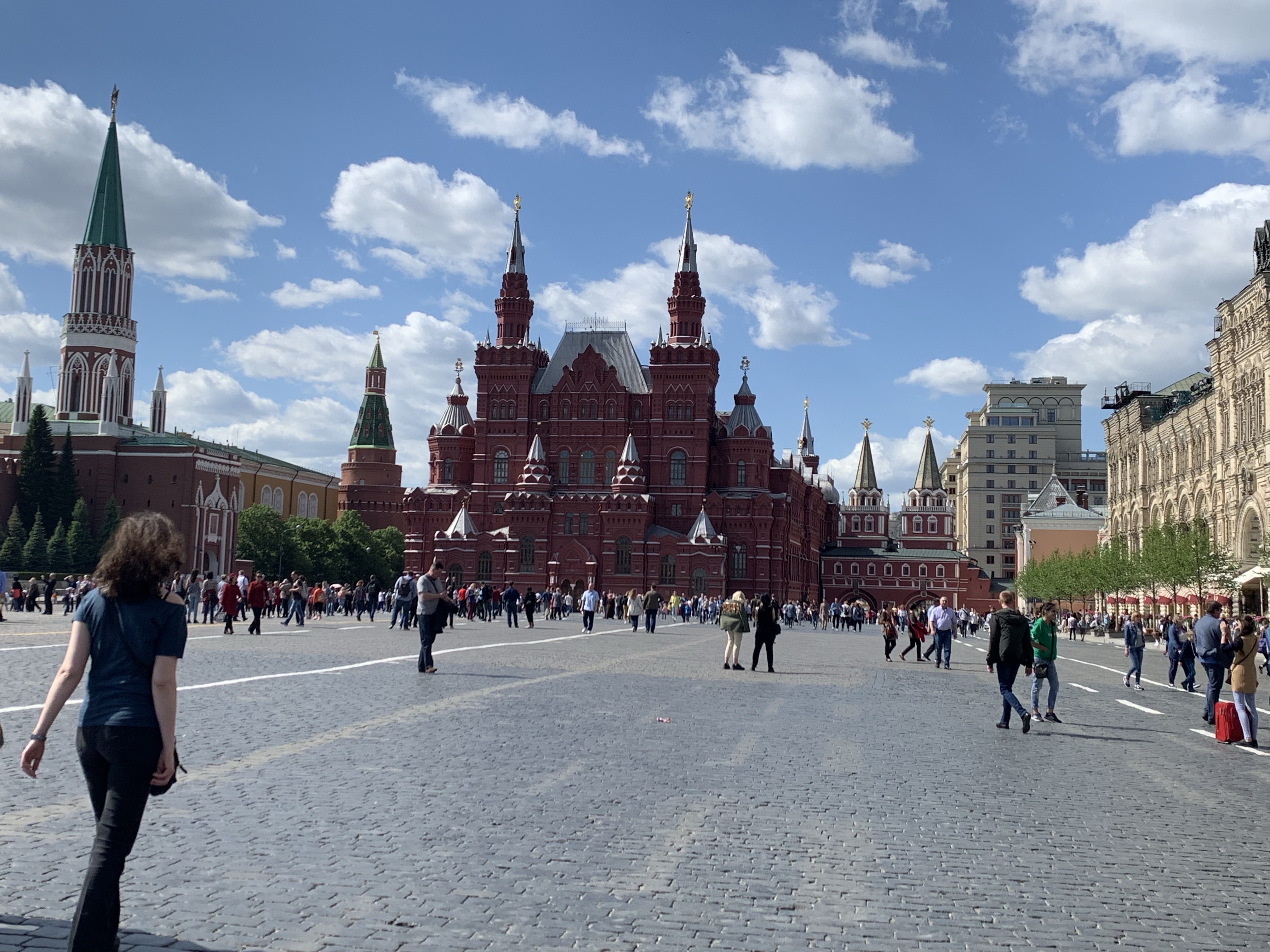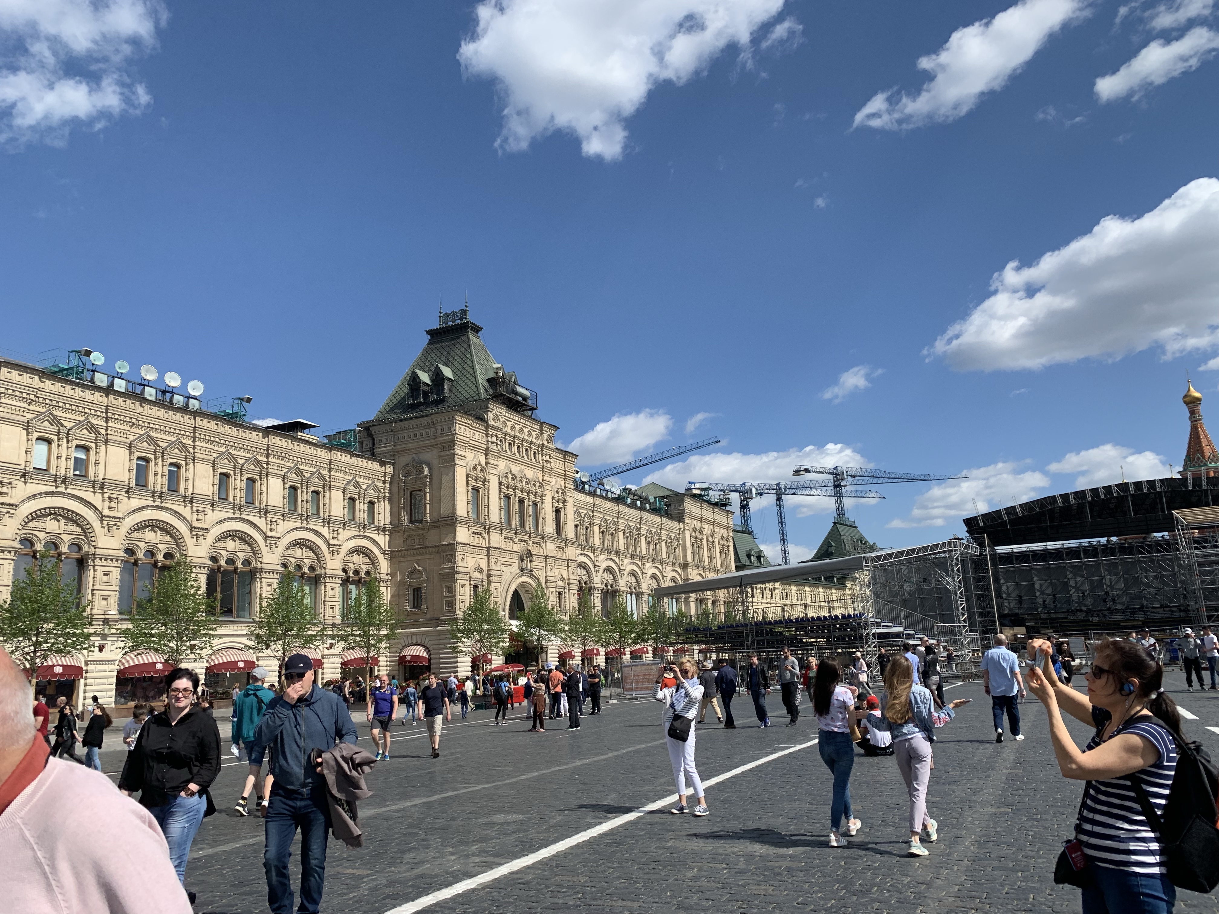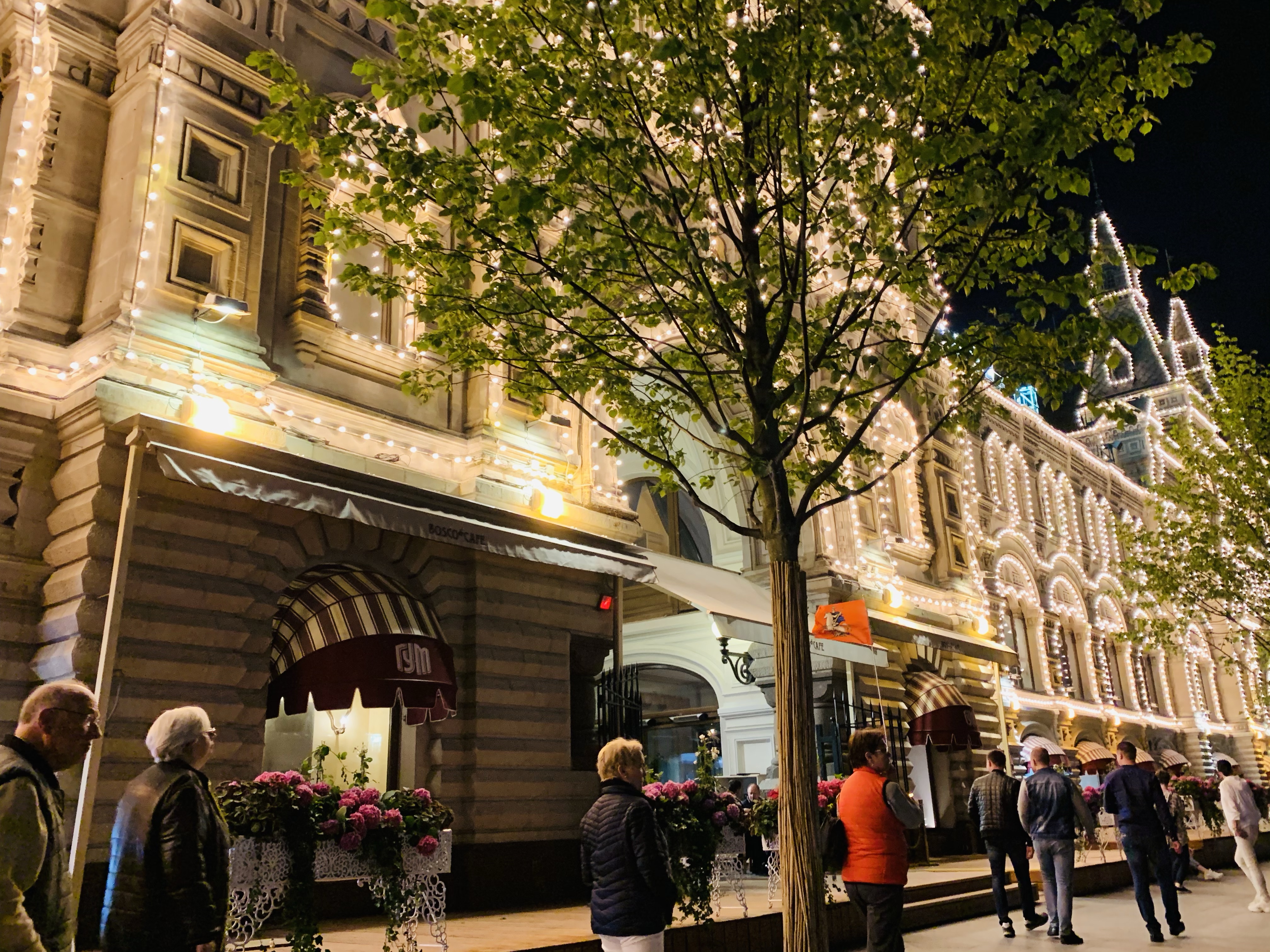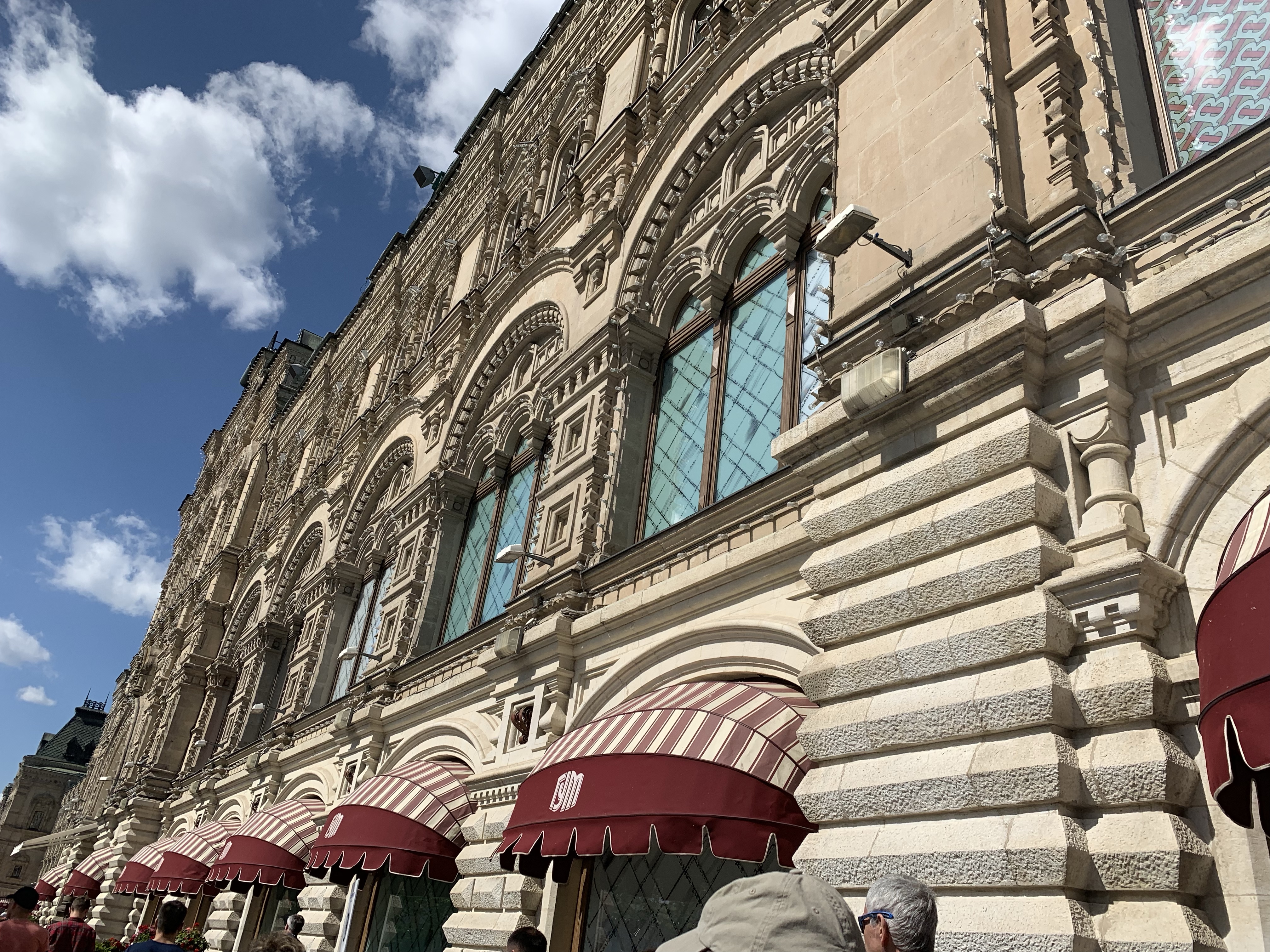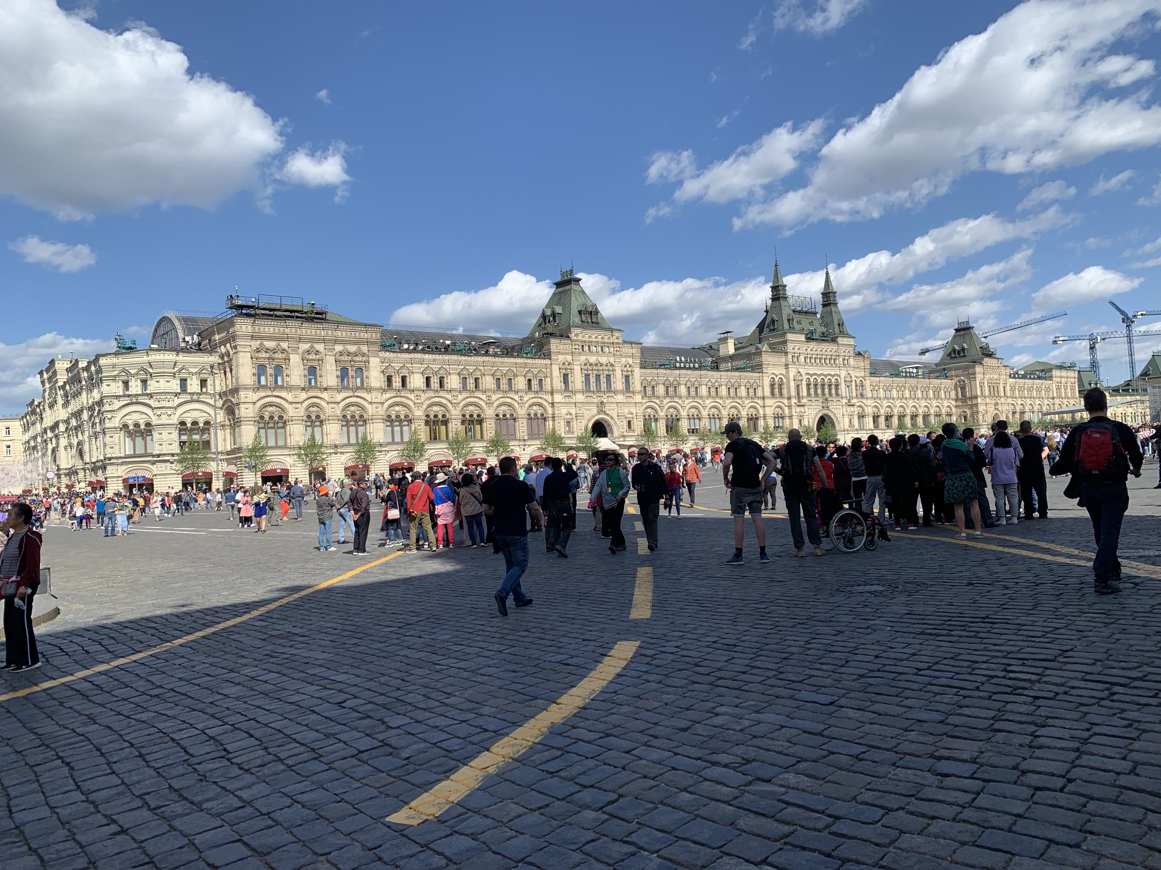 Je suis étonnée par les dimensions de la fameuse Place Rouge célébrée par Gilbert Bécaud avec sa Nathalie : je m’attendais à ce qu’elles fussent phénoménales comme tendent à le démontrer les vidéos faites à l’occasion du 1er mai par exemple. En réalité elle est à taille humaine et on en fait assez rapidement le tour. Imposant en revanche est le magnifique GUM, le très célèbre et très beau grand magasin. En raison de la saison touristique en son début, beaucoup de touristes y circulent sans pour autant causer la moindre gêne.