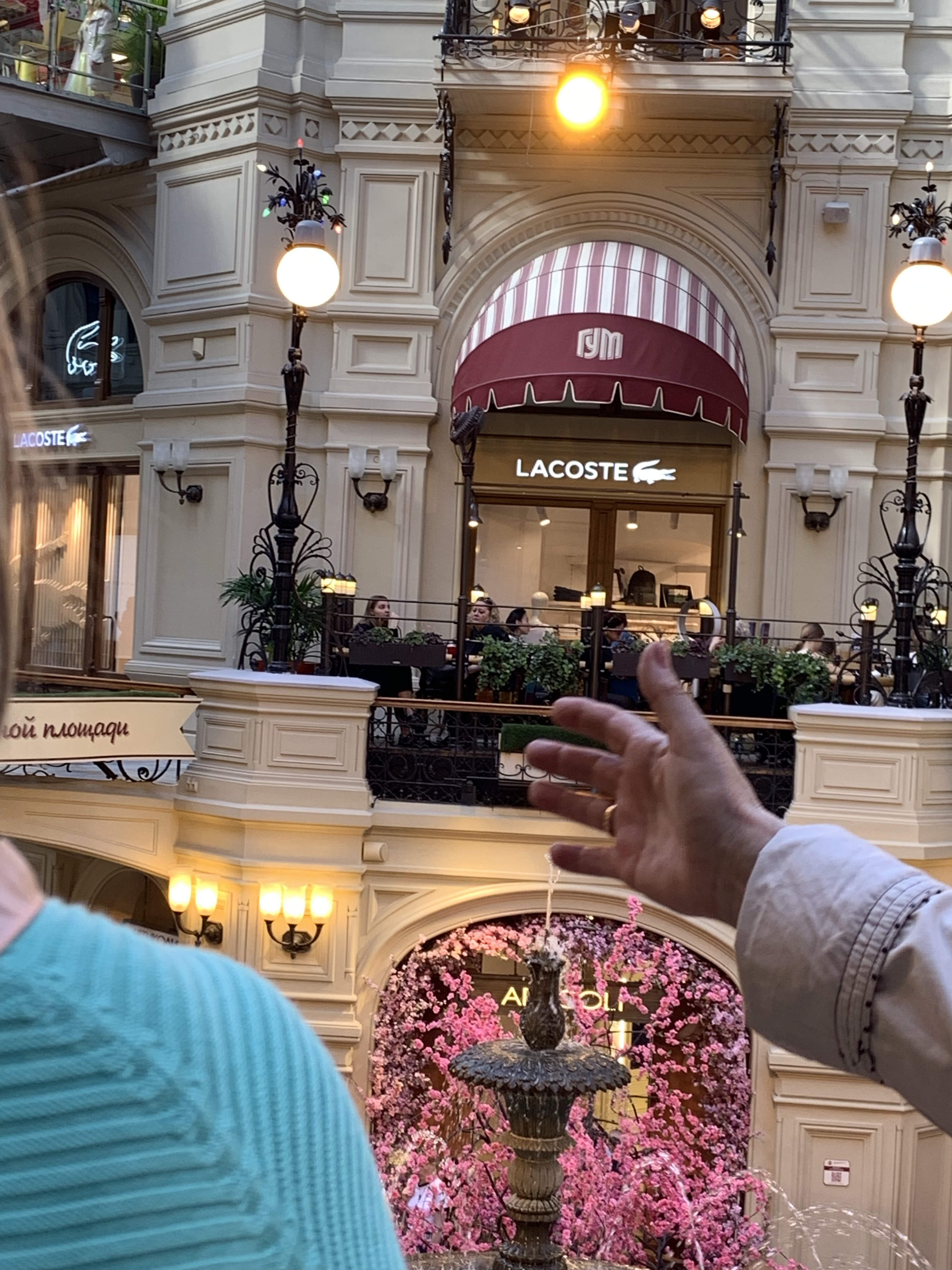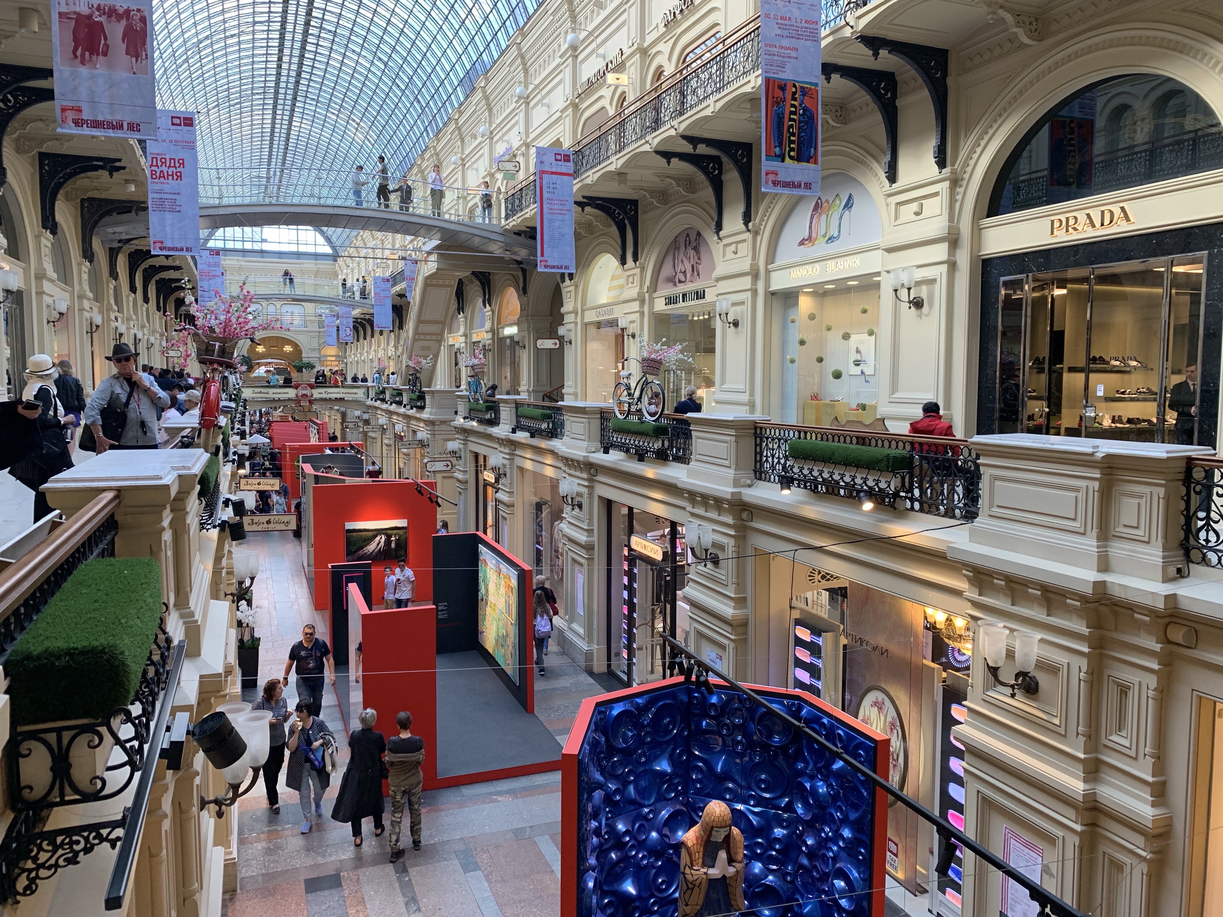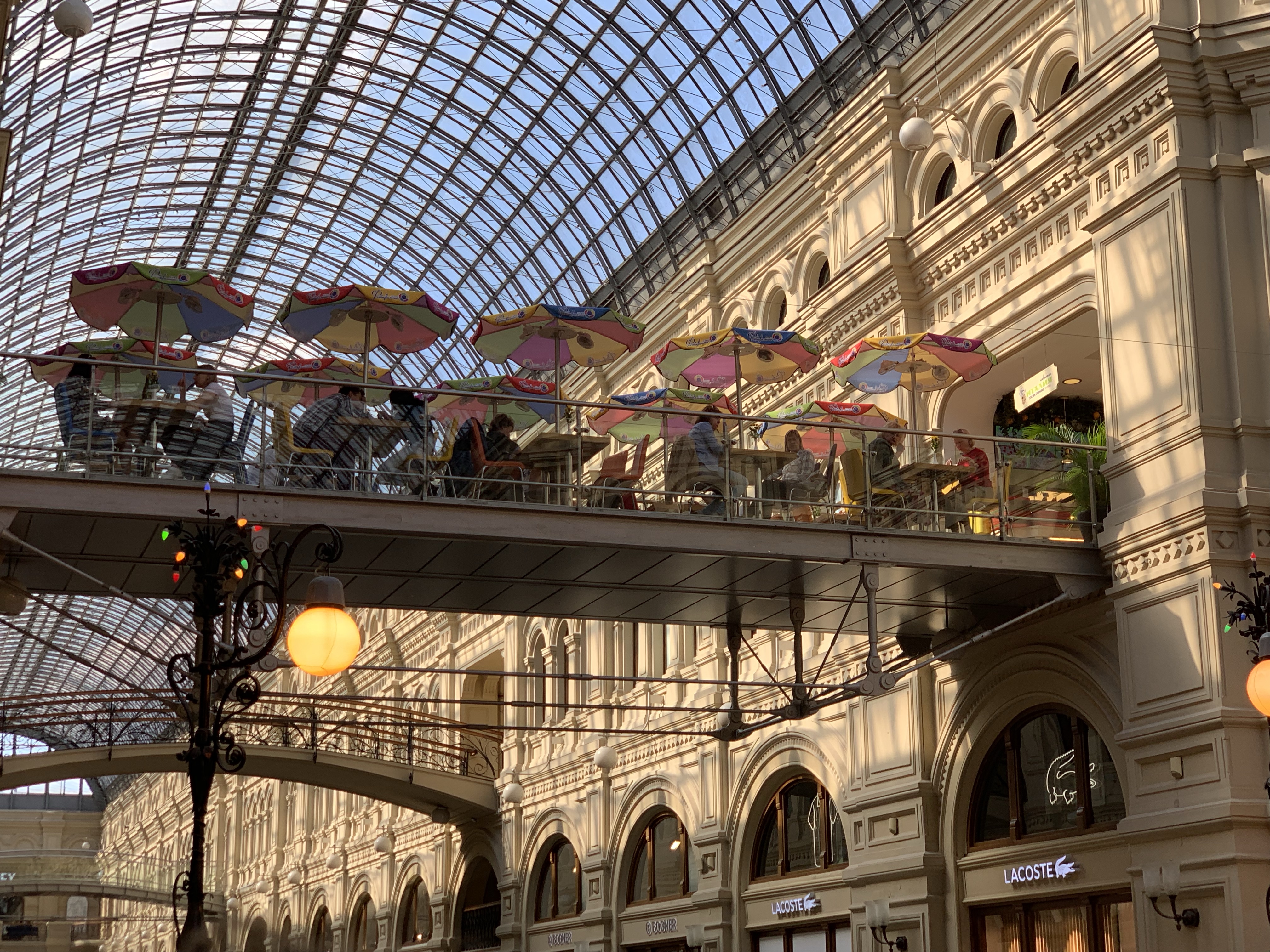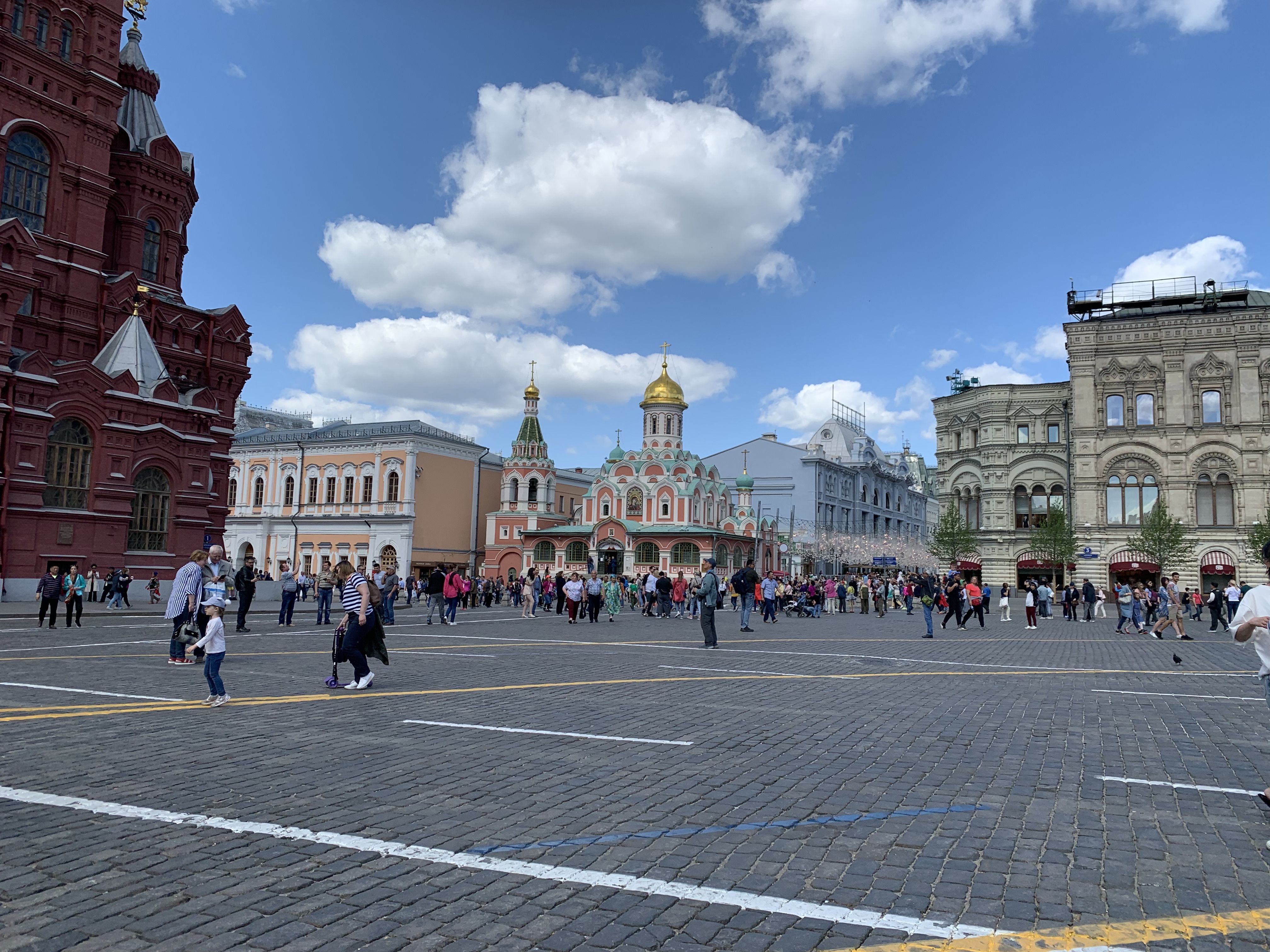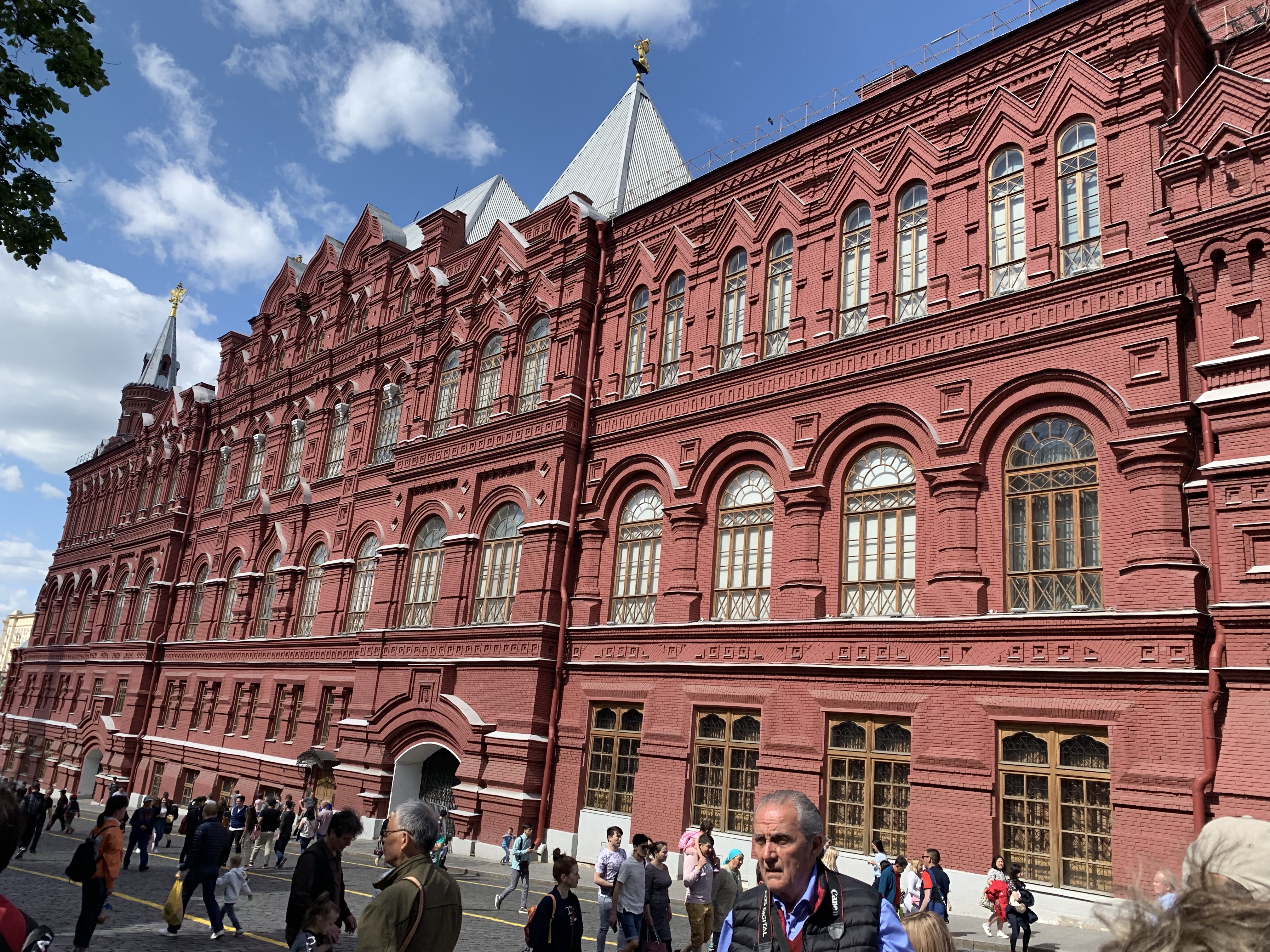 Je suis étonnée par les dimensions de la fameuse Place Rouge célébrée par Gilbert Bécaud avec sa Nathalie : je m’attendais à ce qu’elles fussent phénoménales comme tendent à le démontrer les vidéos faites à l’occasion du 1er mai par exemple. En réalité elle est à taille humaine et on en fait assez rapidement le tour. Imposant en revanche est le magnifique GUM, le très célèbre et très beau grand magasin. En raison de la saison touristique en son début, beaucoup de touristes y circulent sans pour autant causer la moindre gêne.