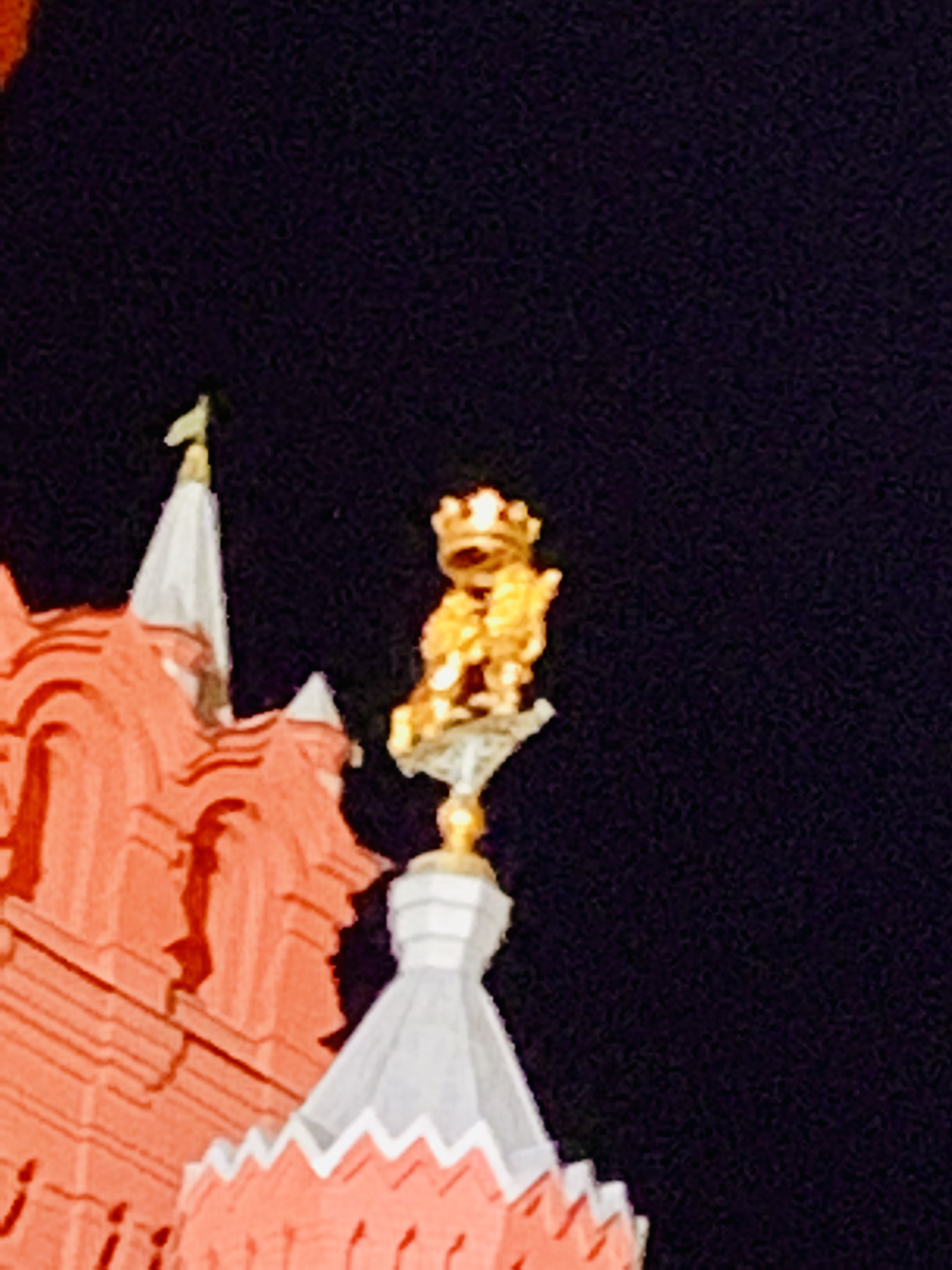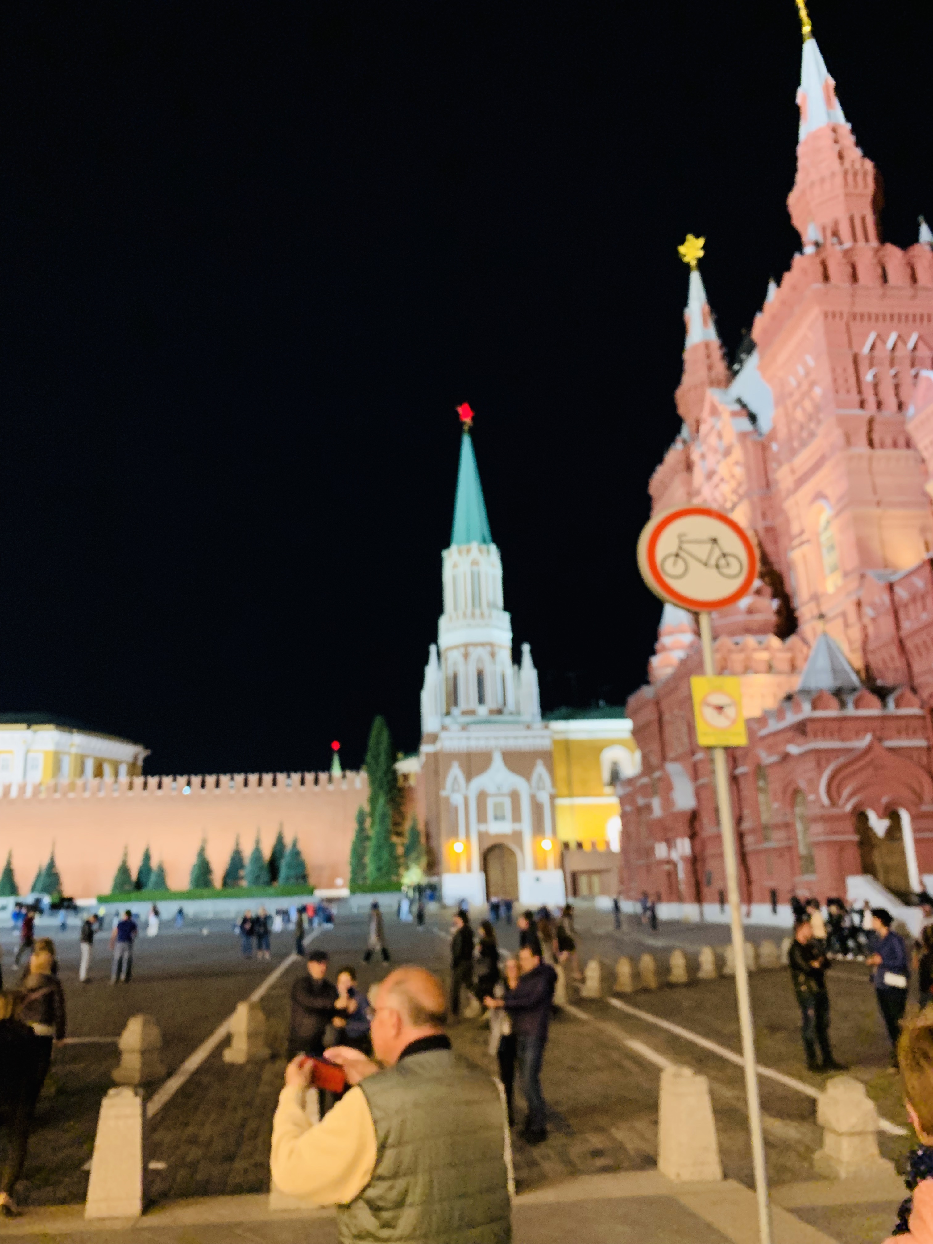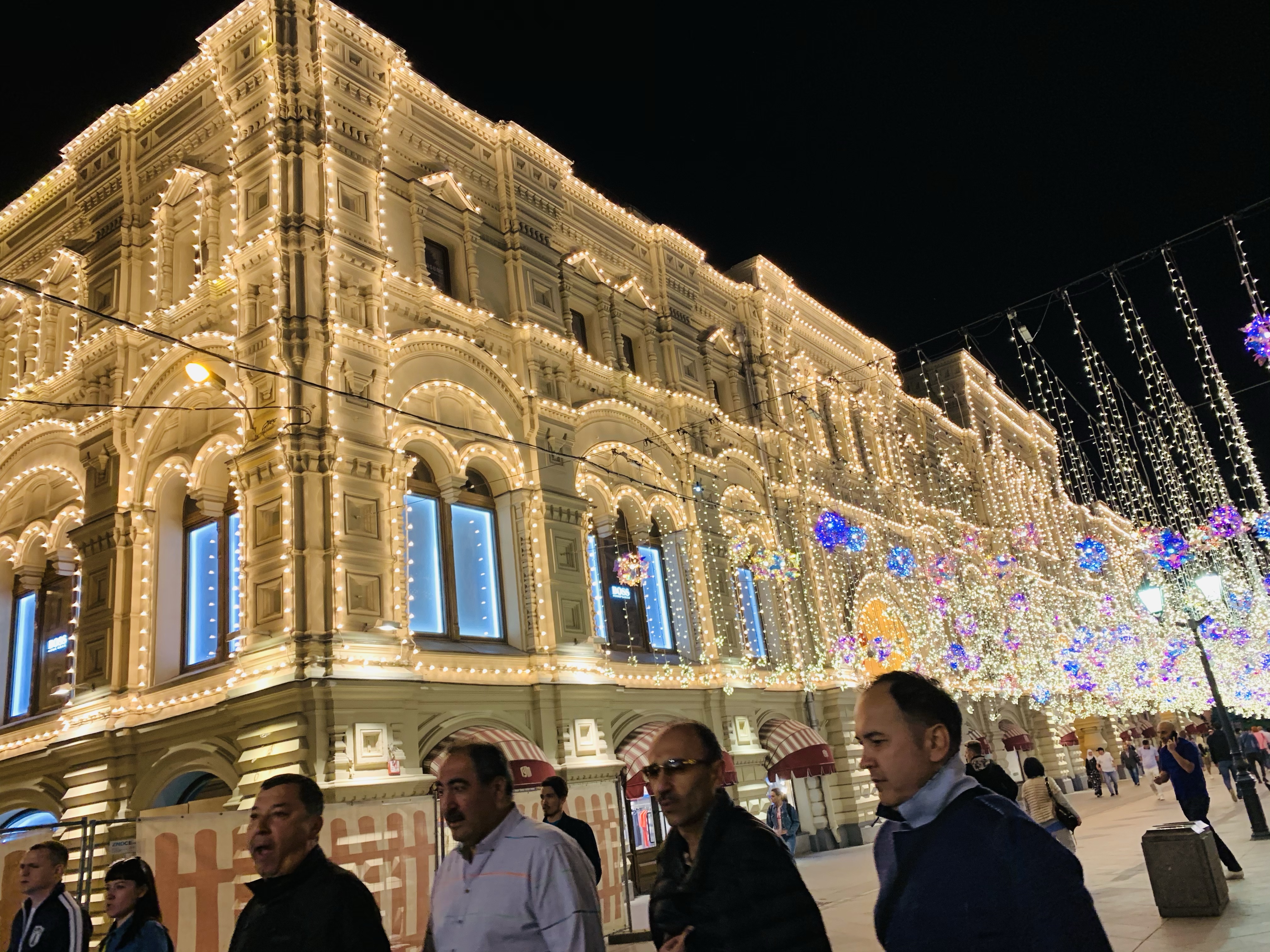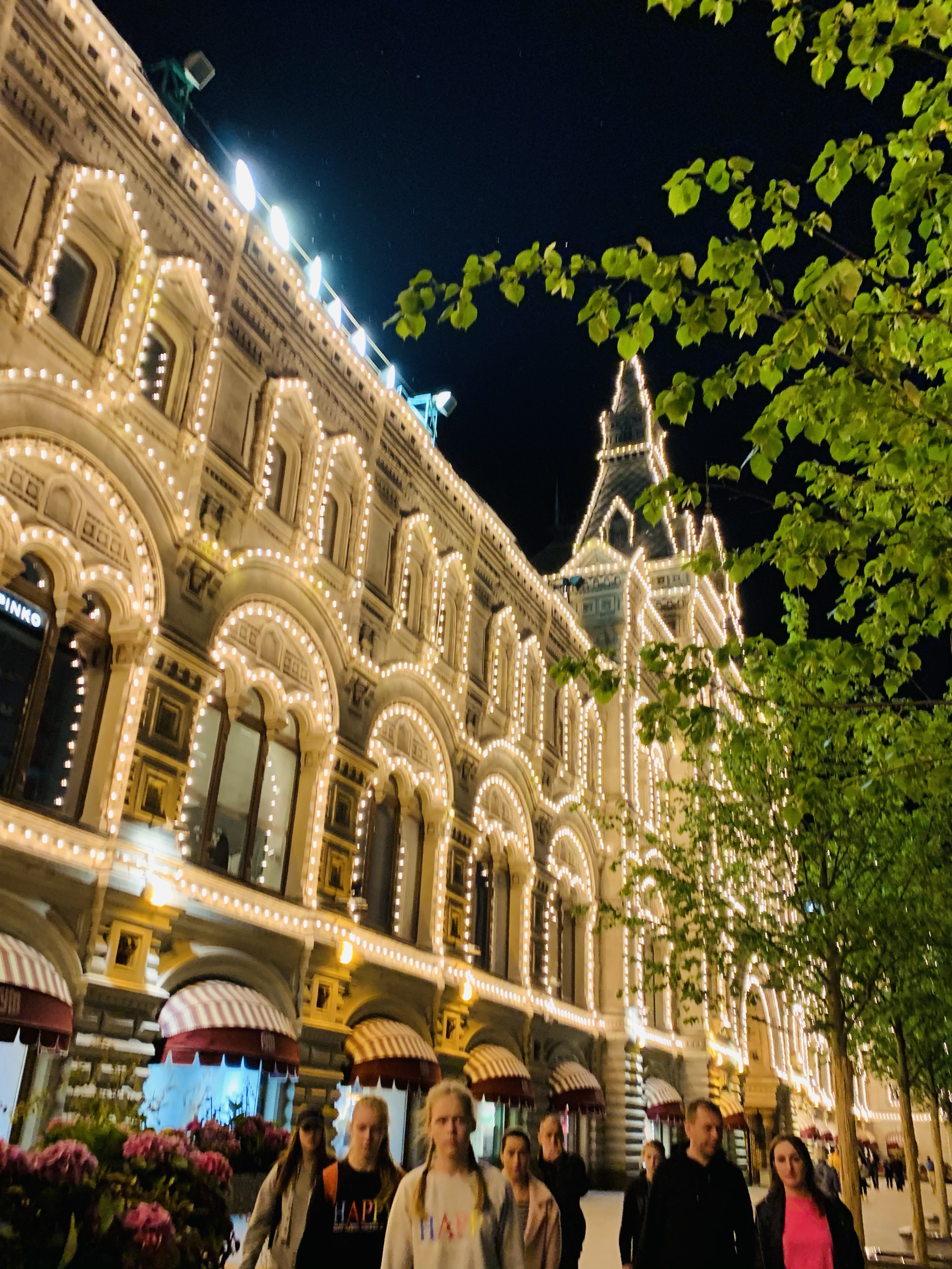 Je suis étonnée par les dimensions de la fameuse Place Rouge célébrée par Gilbert Bécaud avec sa Nathalie : je m’attendais à ce qu’elles fussent phénoménales comme tendent à le démontrer les vidéos faites à l’occasion du 1er mai par exemple. En réalité elle est à taille humaine et on en fait assez rapidement le tour. Imposant en revanche est le magnifique GUM, le très célèbre et très beau grand magasin. En raison de la saison touristique en son début, beaucoup de touristes y circulent sans pour autant causer la moindre gêne.
