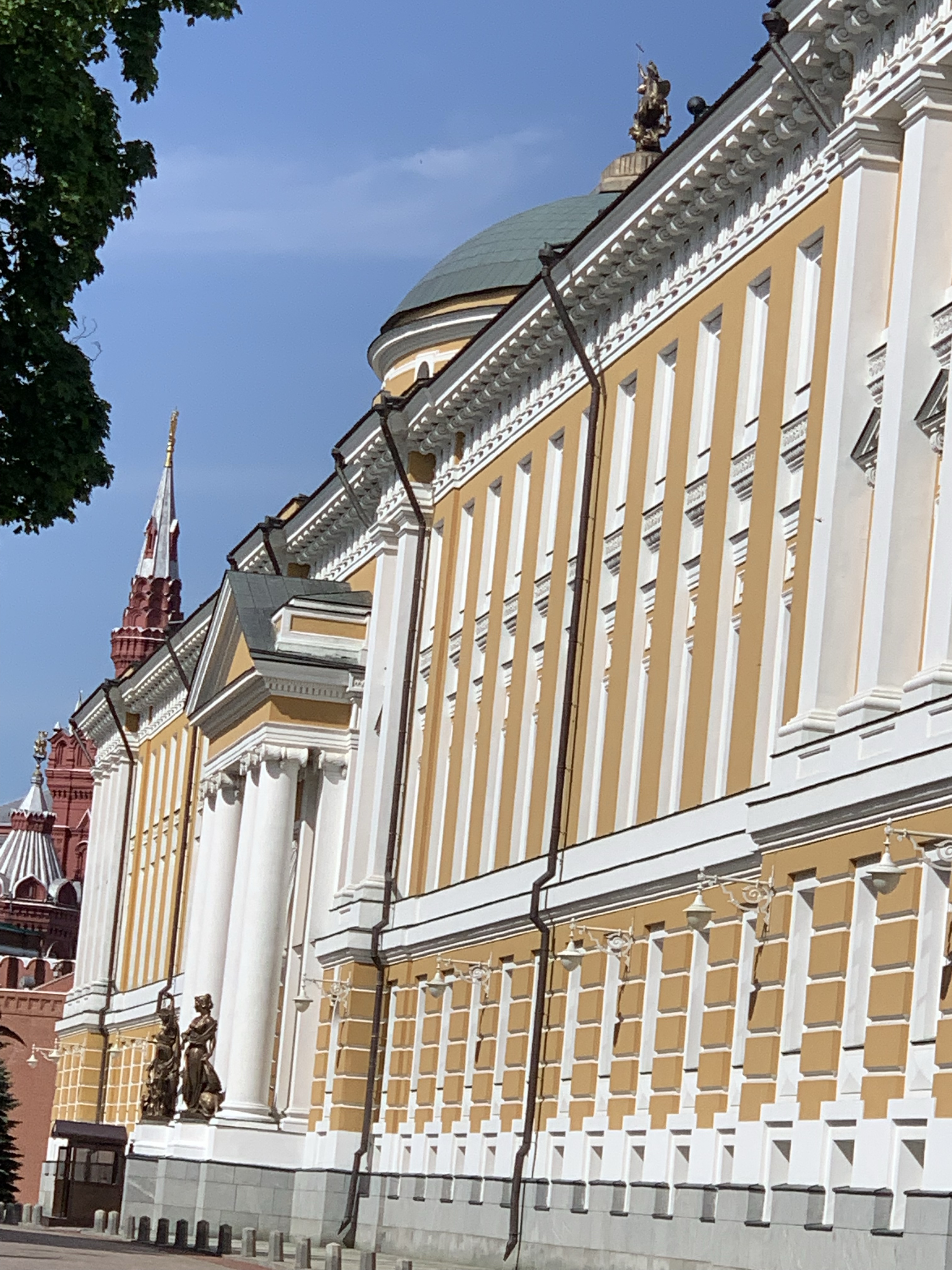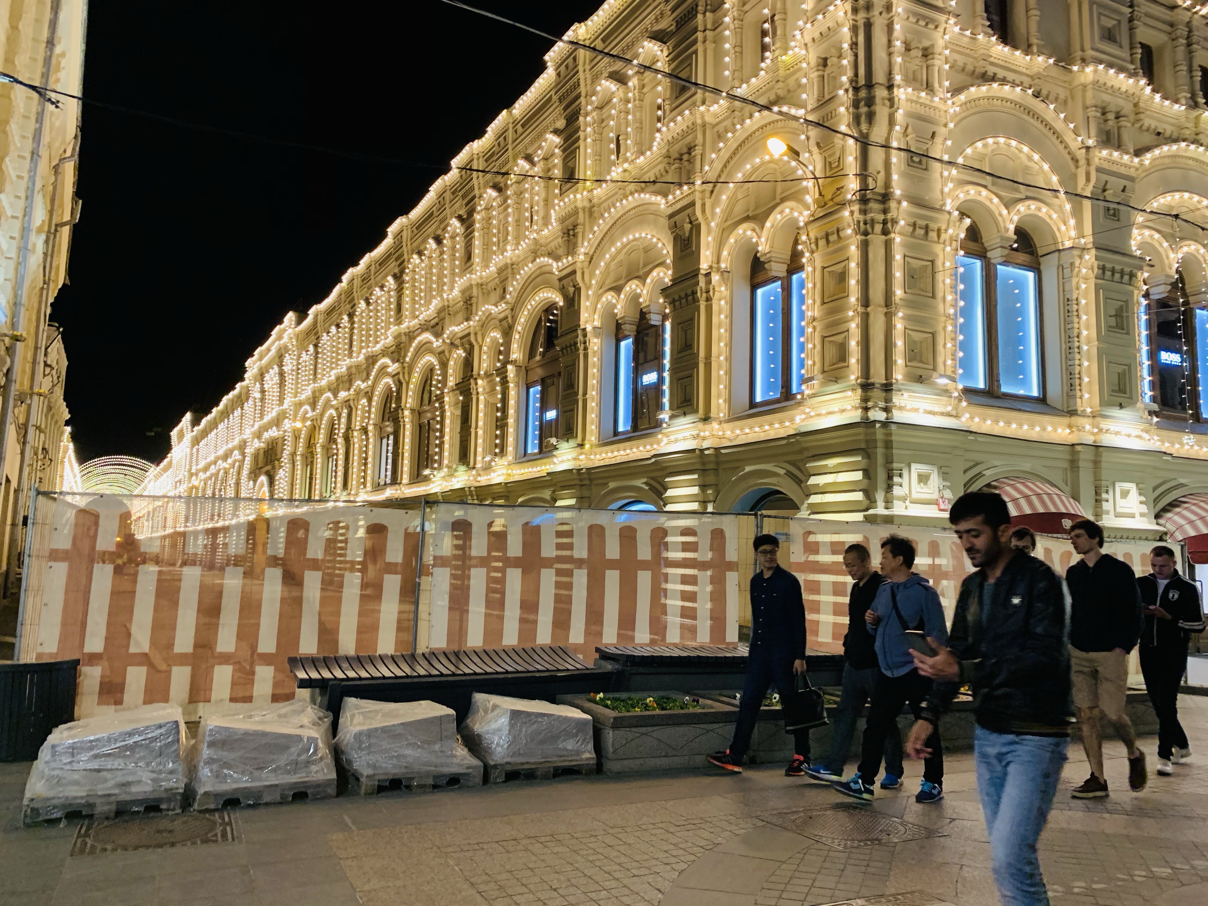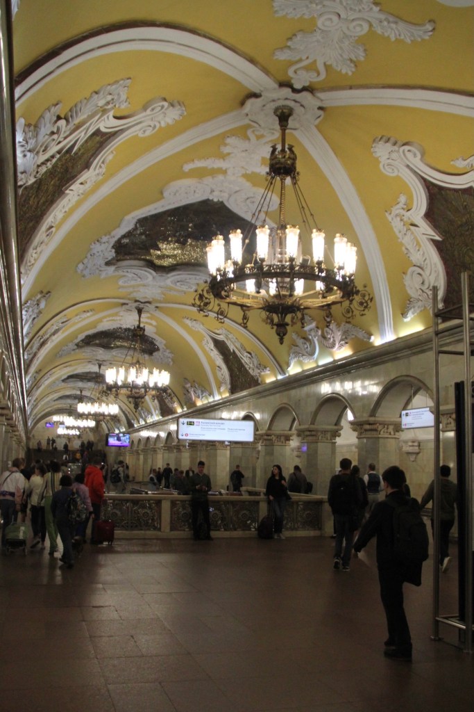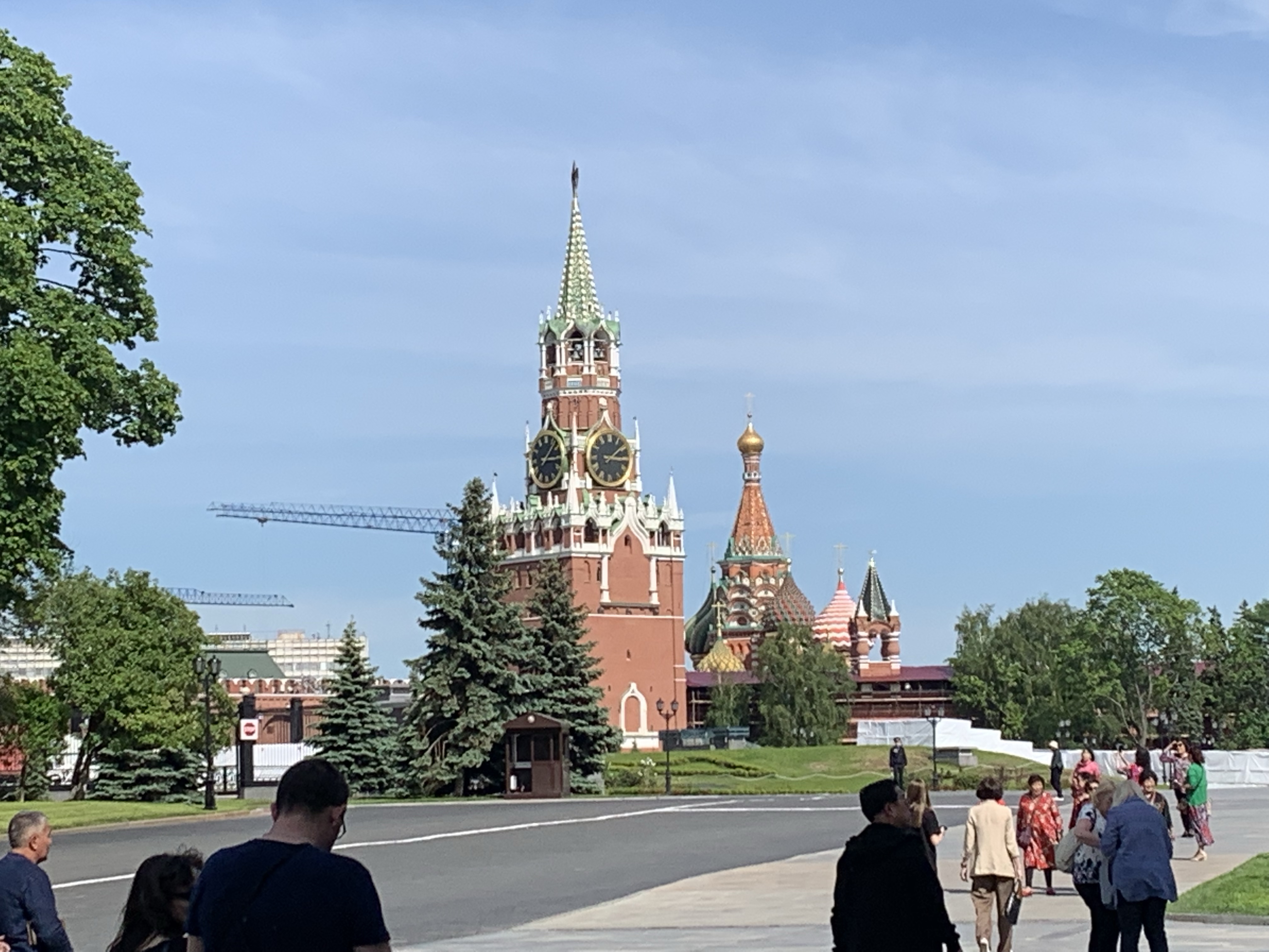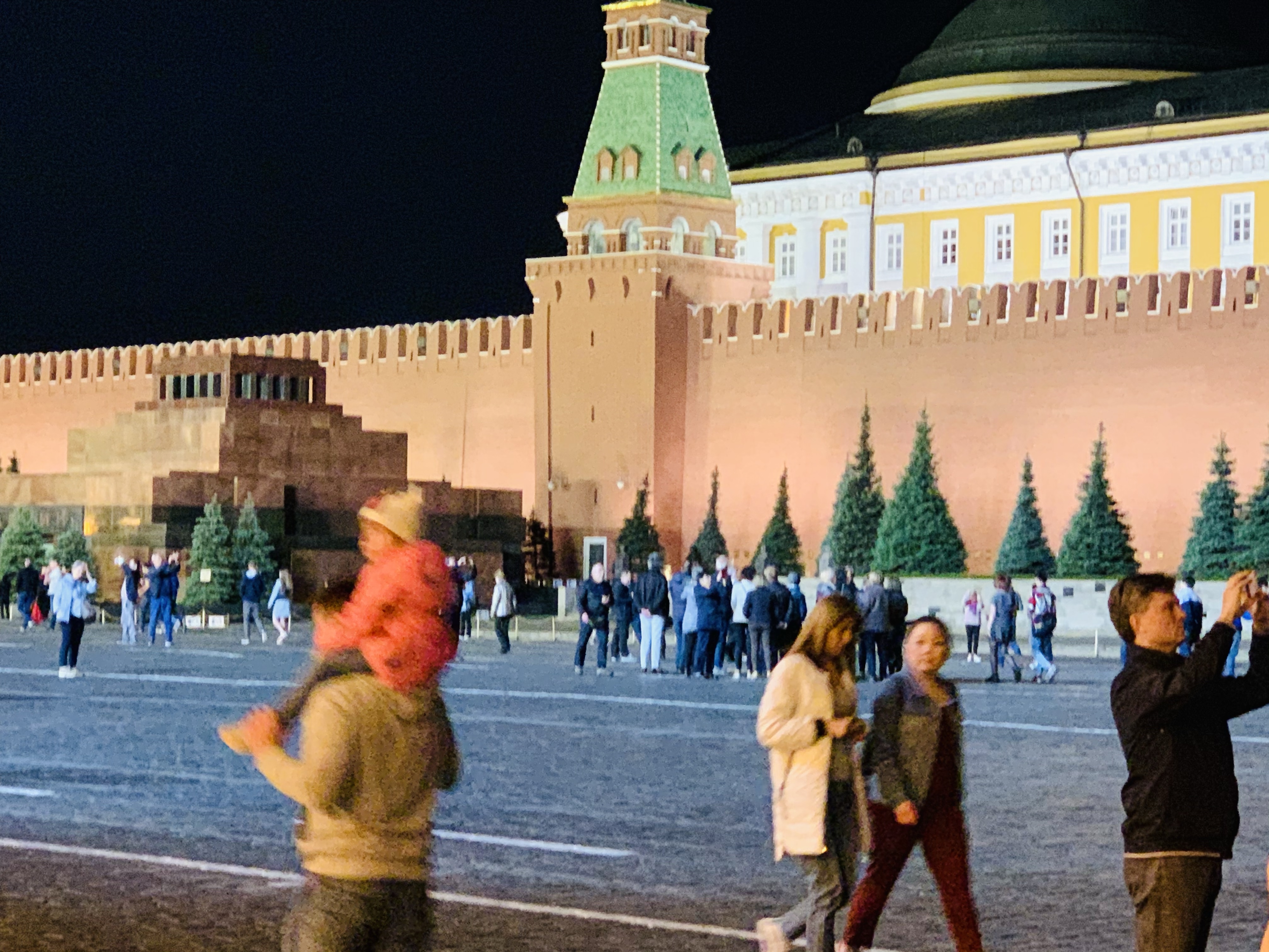 Je suis étonnée par les dimensions de la fameuse Place Rouge célébrée par Gilbert Bécaud avec sa Nathalie : je m’attendais à ce qu’elles fussent phénoménales comme tendent à le démontrer les vidéos faites à l’occasion du 1er mai par exemple. En réalité elle est à taille humaine et on en fait assez rapidement le tour. Imposant en revanche est le magnifique GUM, le très célèbre et très beau grand magasin. En raison de la saison touristique en son début, beaucoup de touristes y circulent sans pour autant causer la moindre gêne.