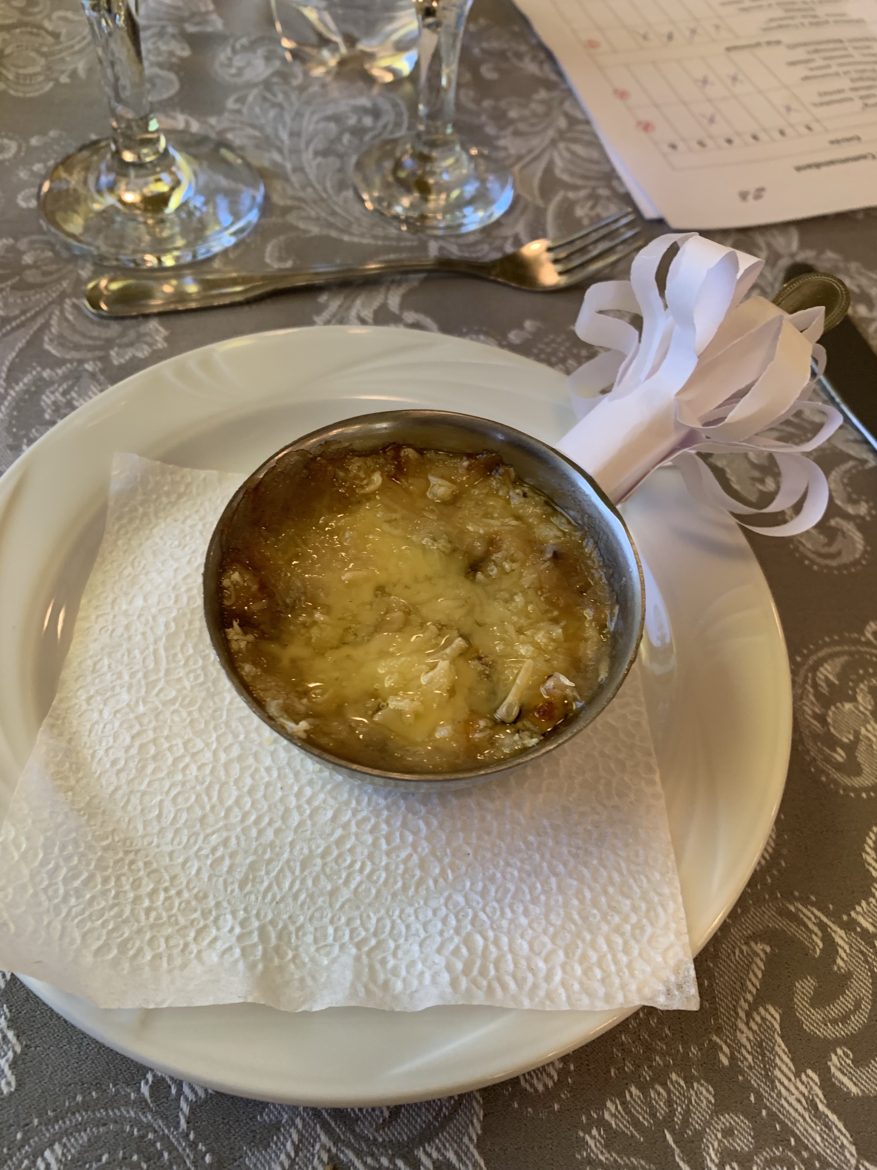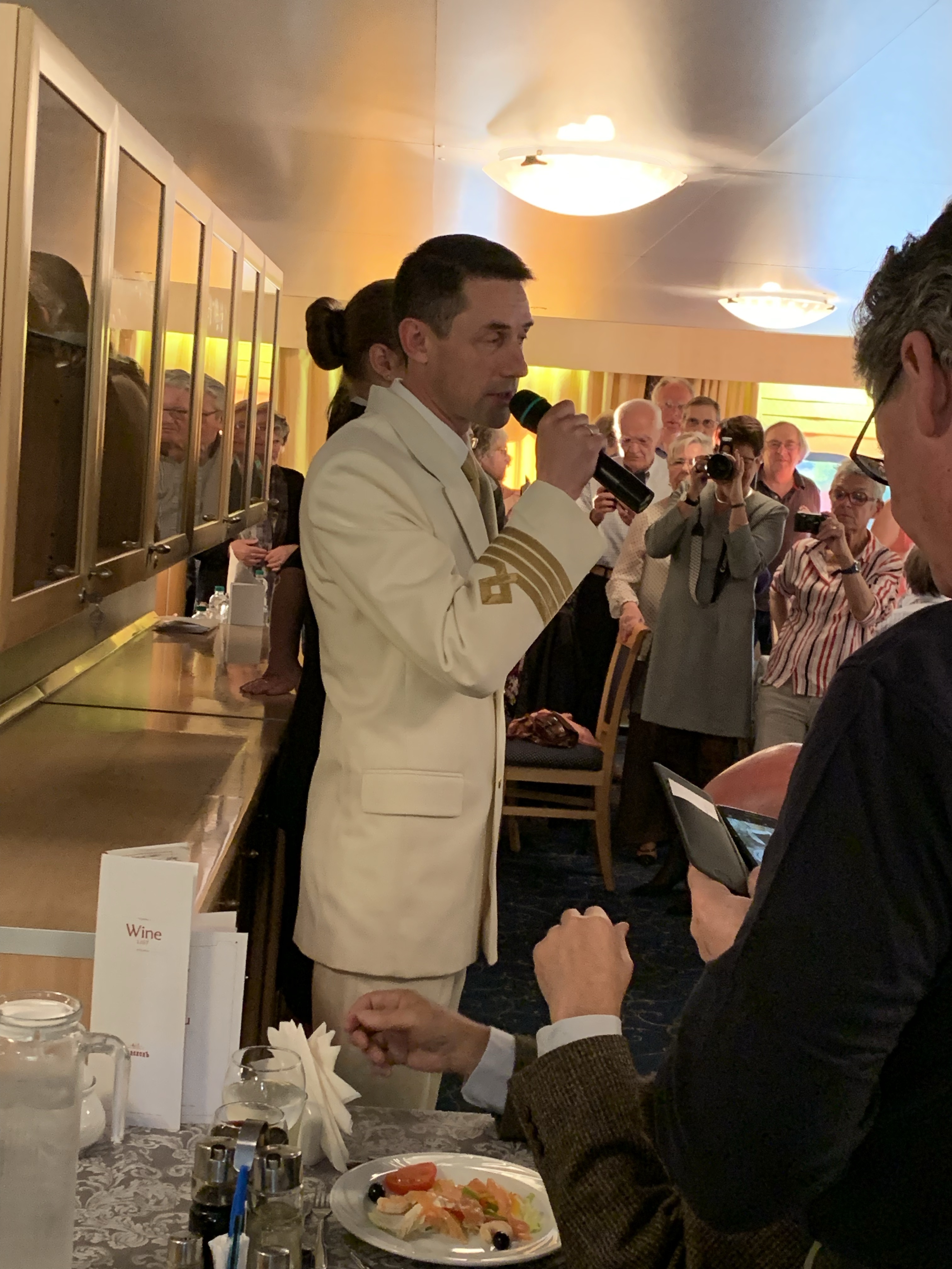 Après une dernière conférence sur l’orthodoxie toujours aussi passionnante nous avons droit à un dîner « amélioré » car celui dit du Commandant animé par des musiciens endiablés. Ceux dont moi qui font partie de la chorale de la croisière, pompeusement surnommée « chorale académique » se retrouvent pour chanter devant les passagers les airs ultra classiques de : Kalinka, les Bateliers de la Volga, les Nuits de Moscou, les Yeux Noirs, mon timbre de soprano s’accommodant assez mal de l’octave de Basse du chef de choeur.