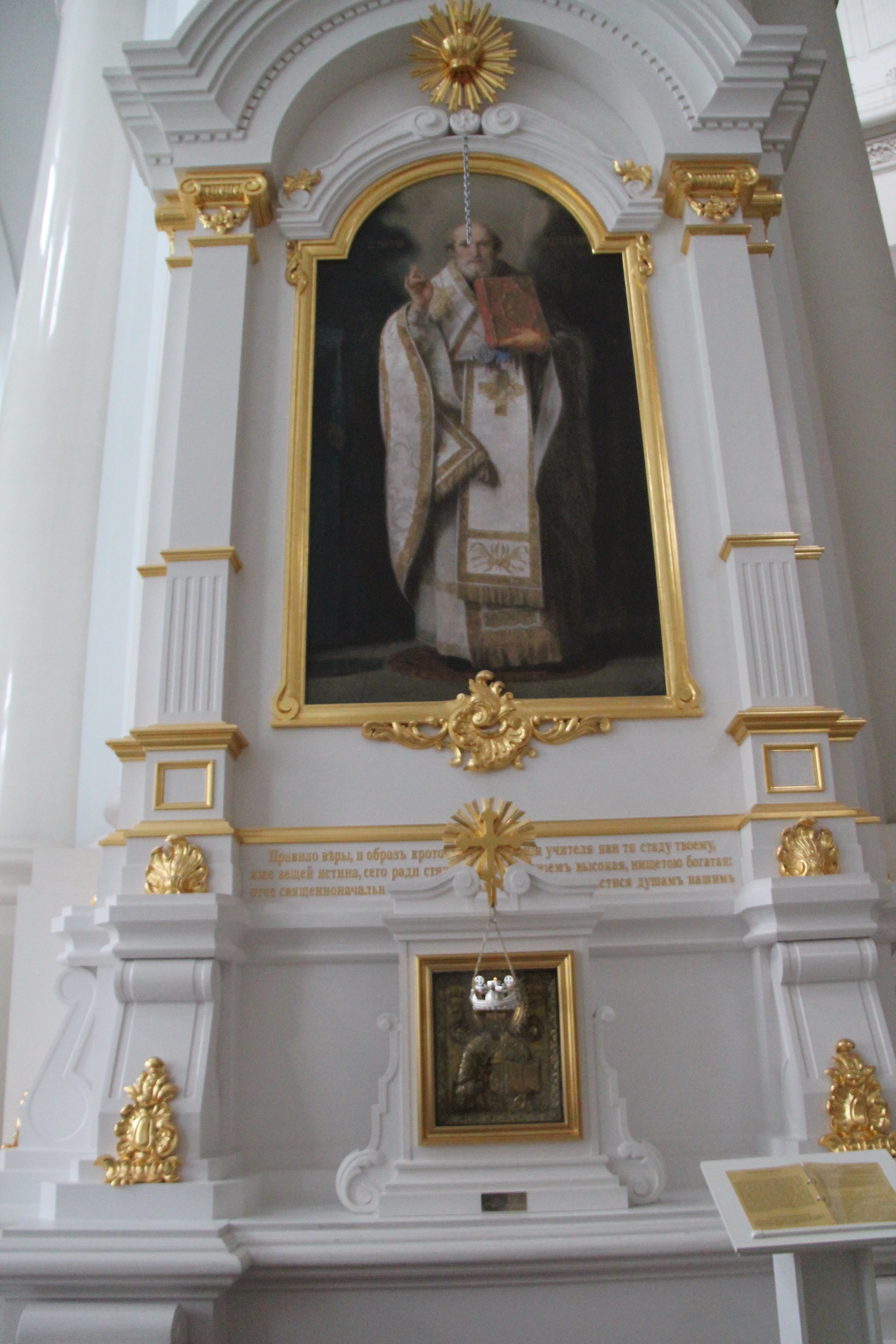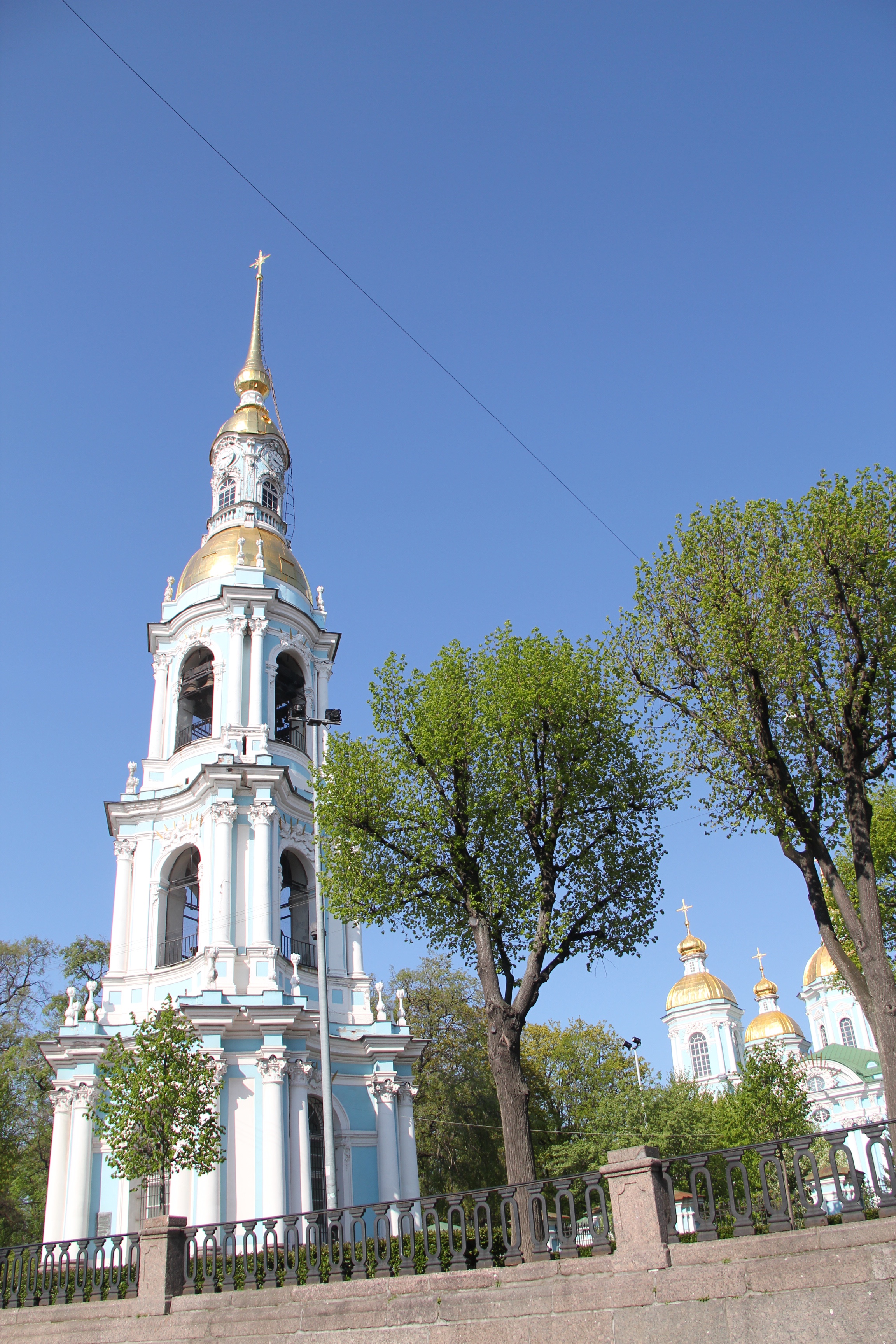 St Nicolas des Marins est une des huit cathédrales de St Pétersbourg, le rite orthodoxe permettant l’édification de plusieurs édifices de ce type dans les villes importantes. Elle est de style baroque russe avec sa façade blanche et bleue, ses colonnes corinthiennes et ses cinq coupoles dorées. Elle est dédiée à St Nicolas, le patron des marins