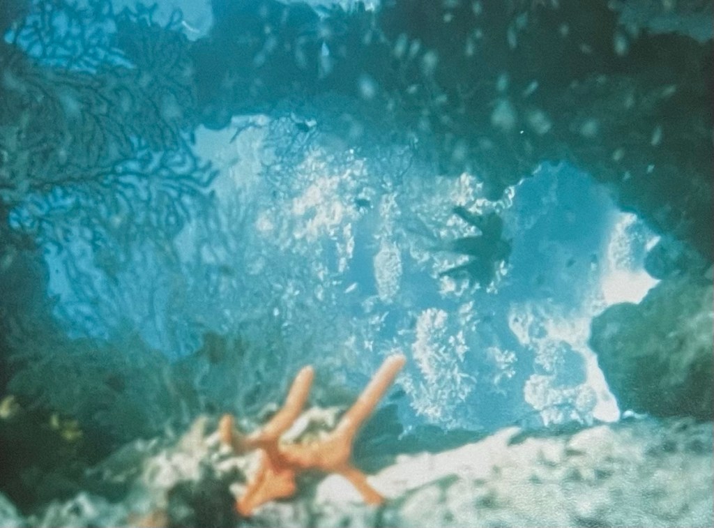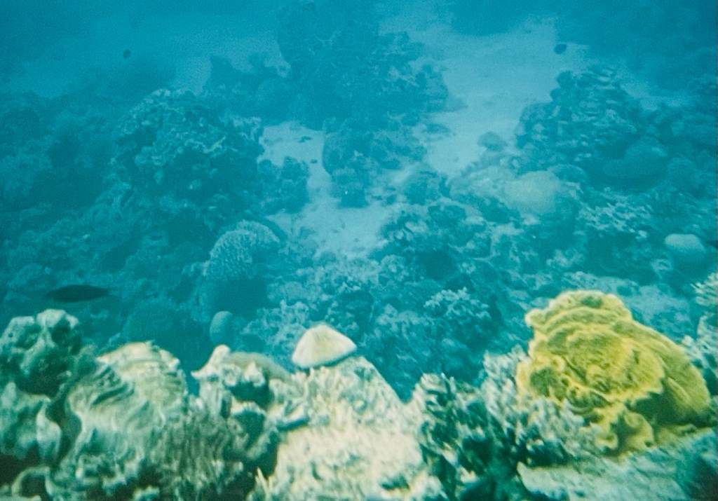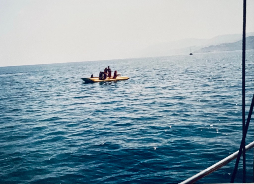 Avant le BBQ, au large on nous fit prendre une espèce de boudin – c’était le tout début des bouées géantes – sans nous dire qu’à l’issue du tour grâce à un virage très serré réalisé par le hors bord qui nous traînait, nous nous retrouverions tous à l’eau et contraints dans une eau scintillante et d’une clarté absolue à nager pour revenir au bateau. Mais quel délice que cette heureuse surprise… mais pour mon mari c’était une première car il n’avait jamais nagé en pleine mer !