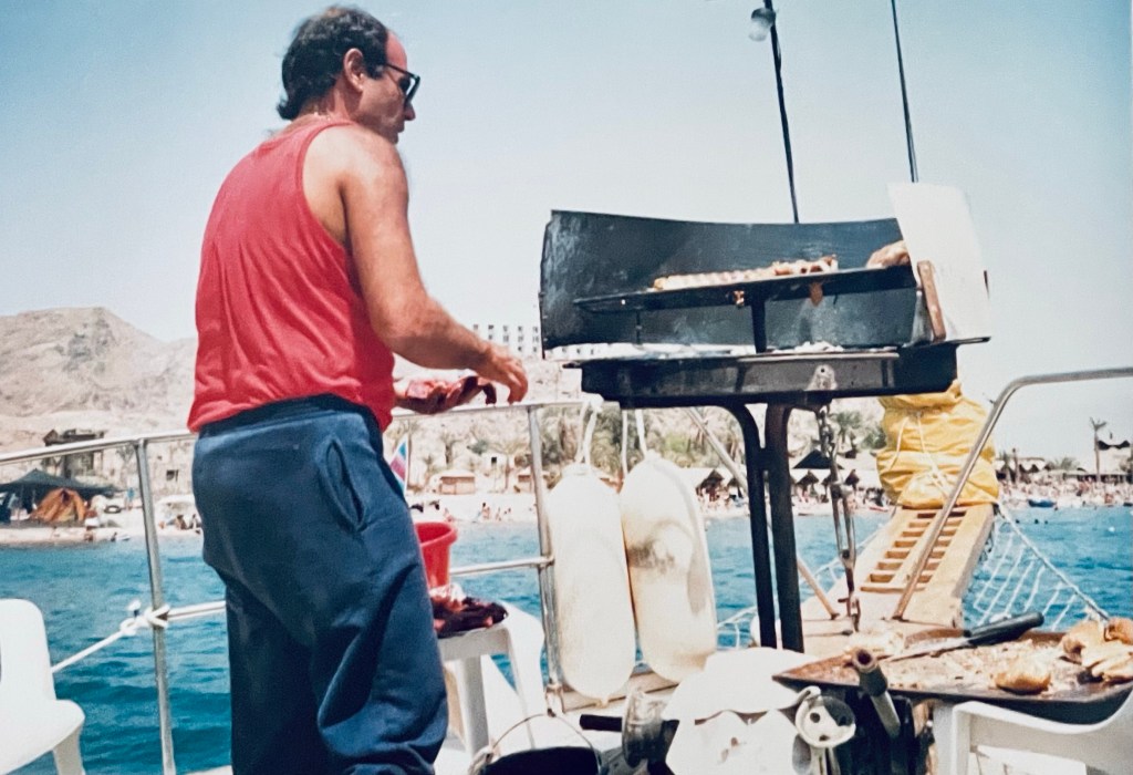 Une parenthèse entre les visites : une sortie sur le bateau l’Eilat affrété par le Club Med et l’occasion de prendre un bain de mer forcé dans une mer fraîche et de déjeuner autour d’un barbecue avec une viande cuite selon nos désirs.