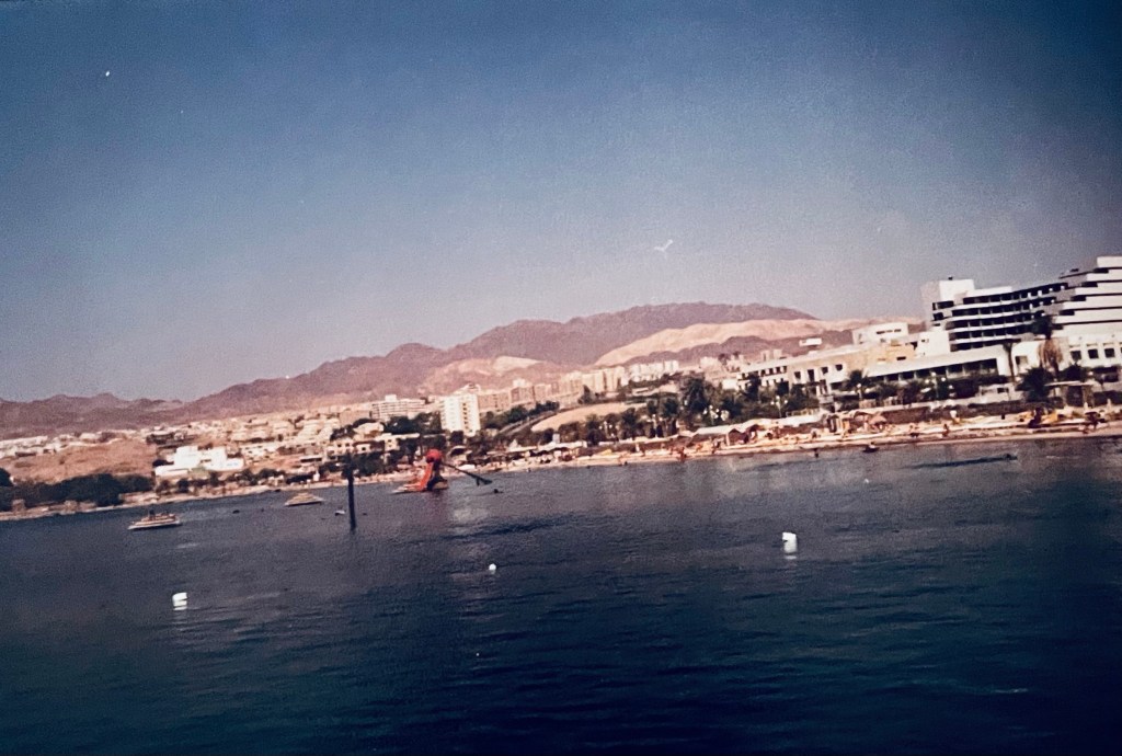 Nous étions partis en fait à Eilat, au Club Med, et dès l’avion nous étions soumis au régime kasher. Je dois avouer que dans un endroit comme Eilat, situé au bord de la Mer Rouge, c’était un peu irréel de ne pas avoir de poissons à arêtes ou de crustacés bannis de la religion juive. Au même titre d’ailleurs que le porc également proscrit mais pour de pures raisons sanitaires à l’origine puisque c’était une viande qui se conservait peu. Mais bon ! on s’y fait, même si nous avons profité d’une excursion sur le bateau du Club Med qui avait pour nom « Eilat » pour pouvoir déjeuner de viande au barbecue cuite enfin comme on le désirait, c’est-à-dire bleue ou saignante, se baigner dans les eaux très bleues de la Mer Rouge appelée ainsi car à certaines heures de la journée les roches rouges qui l’entourent se reflètent dans l’onde et faire de la bouée tirée par un hors-bord pour se faire renverser ensuite dans cette eau chaude. Je me souviens que nous n’avions pas le droit de dépasser les eaux israéliennes car Israël est cerné par l’Egypte et la Jordanie, Eilat est une ville balnéaire et portuaire du sud d’Israël, au bord de la mer Rouge. Ses plages sont réputées pour leurs eaux calmes, comme celles du Dolphin Reef où il n’est pas rare d’observer des mammifères aquatiques. Idéale pour faire de la plongée avec tuba ou bouteille, la réserve naturelle de Coral Beach propose des sentiers sous-marins jonchés de balises flottantes parmi les récifs poissonneux. Non loin de là, au large, le parc marin de l’observatoire sous-marin d’Eilat comprend un centre d’observation immergé et vitré. Eilat est très prisée des plongeurs par son observation de la faune et de la flore marines. Les récifs coralliens et les milliers de poissons de la Mer Rouge font d’Eilat un spot de plongée apprécié aussi bien par les plongeurs confirmés que par les débutants qui peuvent, par exemple, plonger avec des dauphins en liberté au Dolphin Reef.