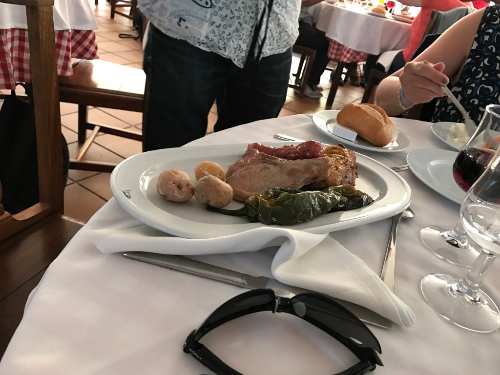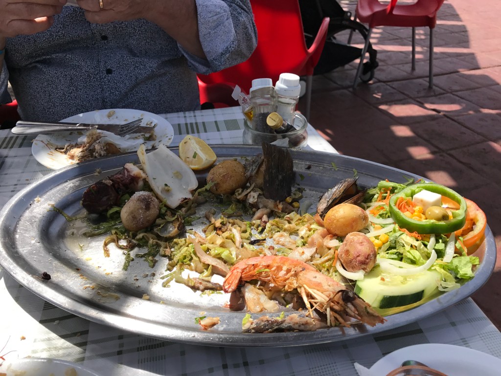 Je ne parle pas du plus beau village de Lanzarote « Yaiza » mais je ne peux manquer d’évoquer le petit restaurant sur une plage auquel nous nous sommes arrêtés et auquel nous avons déjeuné d’une assiette de divers poissons, crustacés et fruits de mer dont nous avons laissé quelques arêtes. Ci-dessous les images n’ont pas voulu se placer comme je le souhaitais, mais on voit l’état du plat après et avant !!!