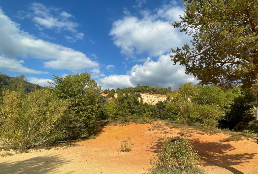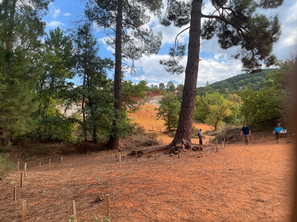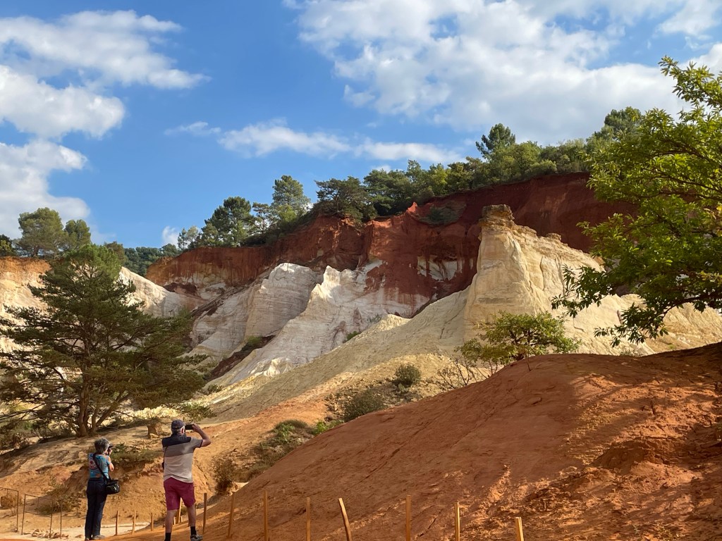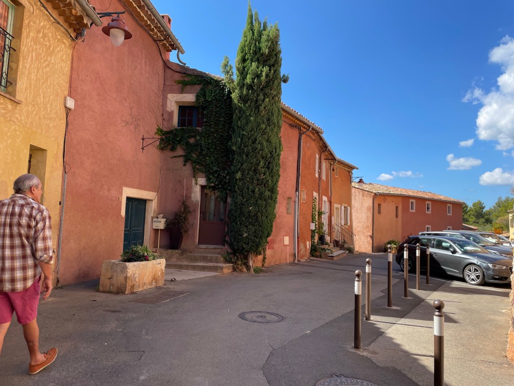 D’abord l’étonnement : ce village situé sur un pic entièrement ocré, ensuite l’animation un 22 septembre créée, par un grand nombre de touristes ; après nous être assurés d’une réservation dans un restaurant, nous avons commencé avant toute visite de ce beau village, cité emblématique du Luberon et reconnu en tant que l’un des plus beaux de France, par la randonnée du Sentier des Ocres situé juste à l’entrée.