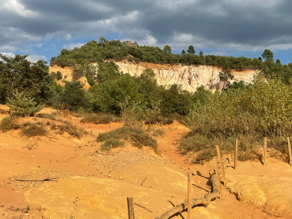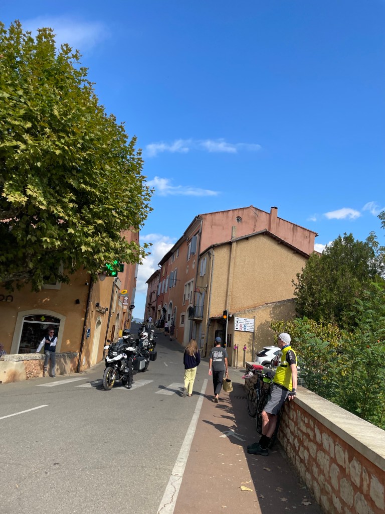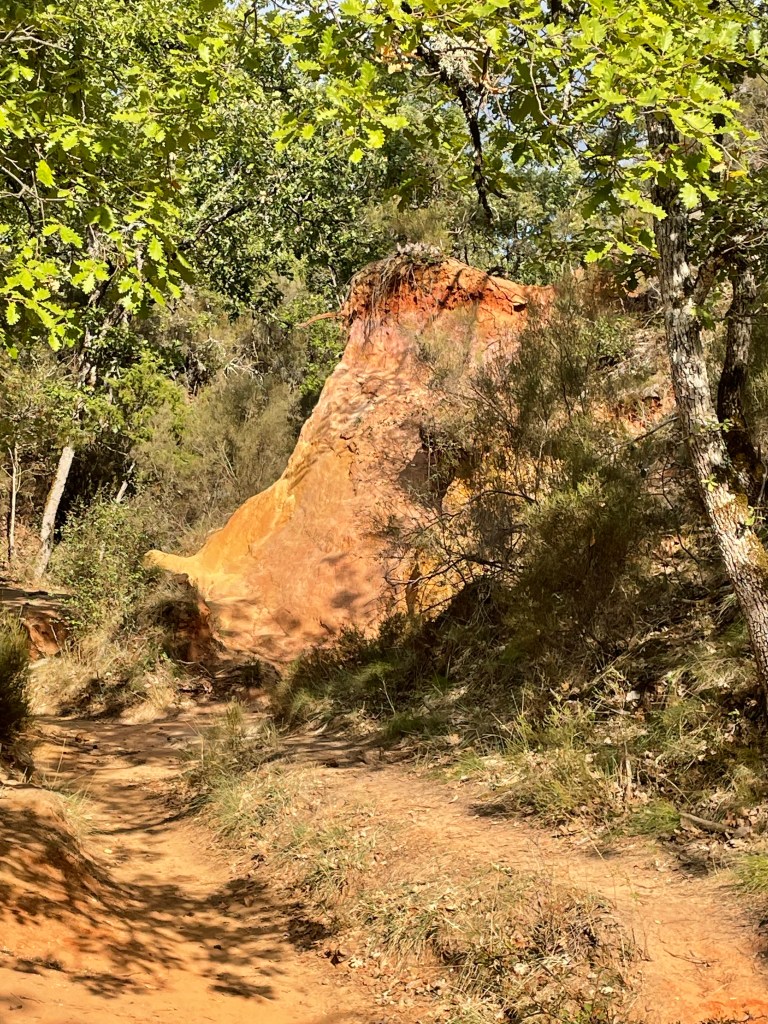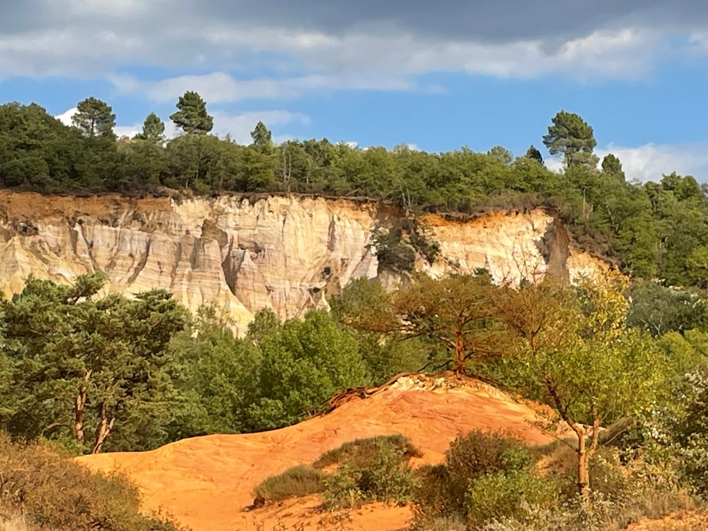 D’abord l’étonnement : ce village situé sur un pic entièrement ocré, ensuite l’animation un 22 septembre créée, par un grand nombre de touristes ; après nous être assurés d’une réservation dans un restaurant, nous avons commencé avant toute visite de ce beau village, cité emblématique du Luberon et reconnu en tant que l’un des plus beaux de France, par la randonnée du Sentier des Ocres situé juste à l’entrée.