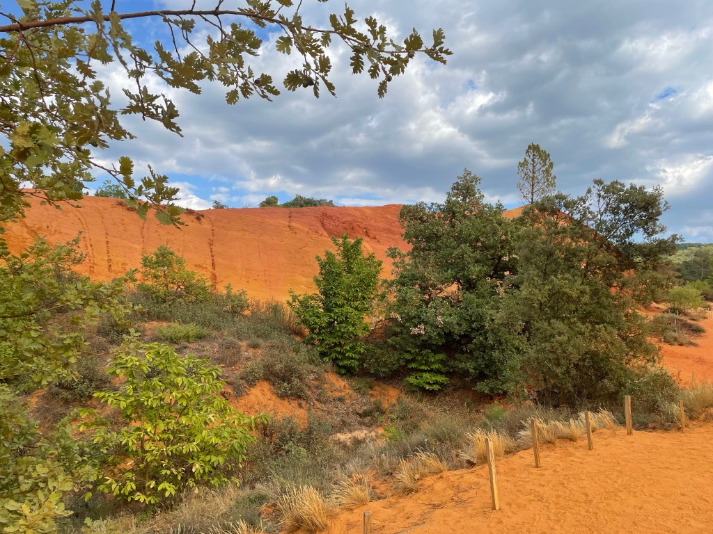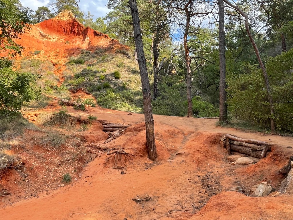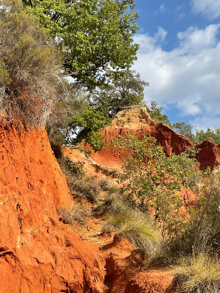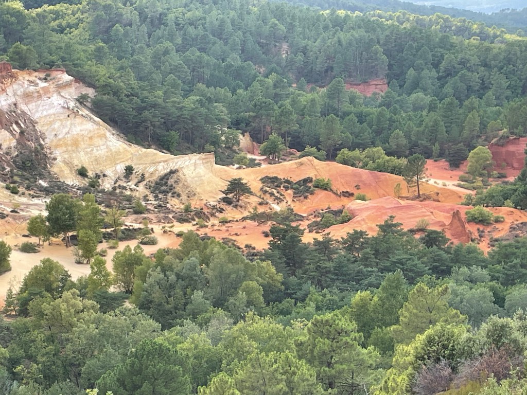 Pour la randonnée du Sentier des Ocres deux parcours sont proposés de 30 et 50 mn. Nous sommes époustouflés par les paysages spectaculaires qui s’offrent à nous dès le départ. L’ocre est partout, étalant ses variations de couleursnaturelles, ses paysages façonnés par l’eau, le vent et la main de l’homme. Pour ma part, j’ai abandonné mon mari pour rejoindre la grande boucle que j’ai parcourue pendant un long moment seule. Parvenue au sommet la vue sur le parc était incomparable. C’est ainsi qu’on voyage grâce à ces ocres du désert du Sahara au Grand Canyon américain, en passant par la Cappadoce turque.