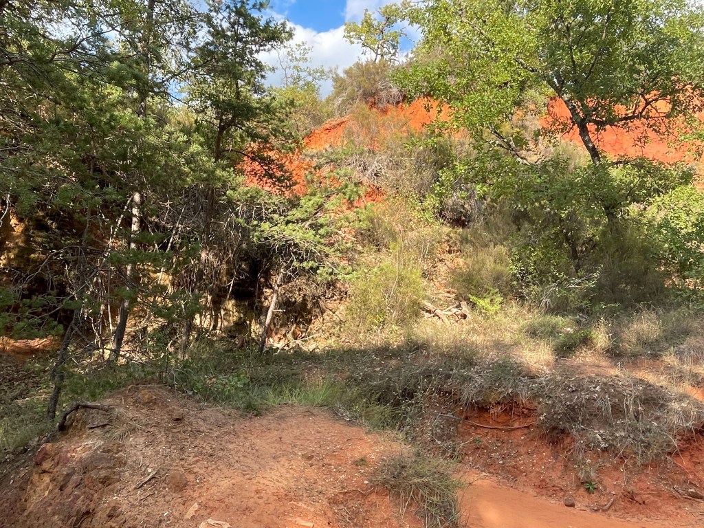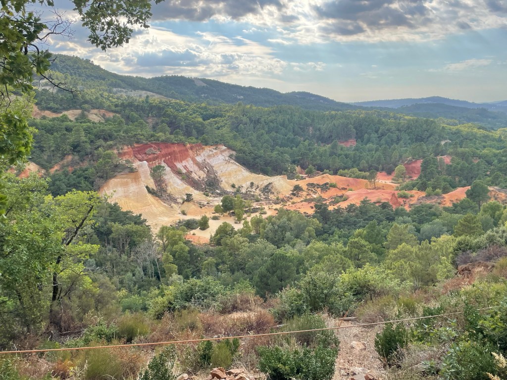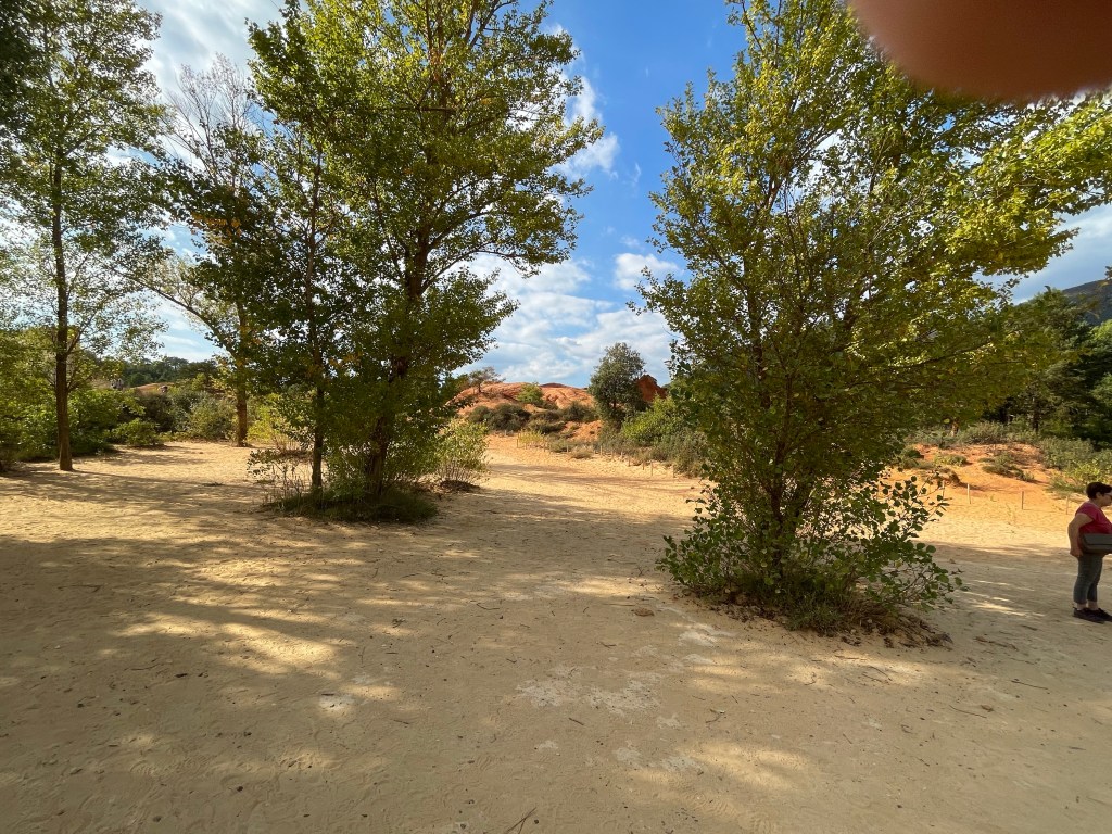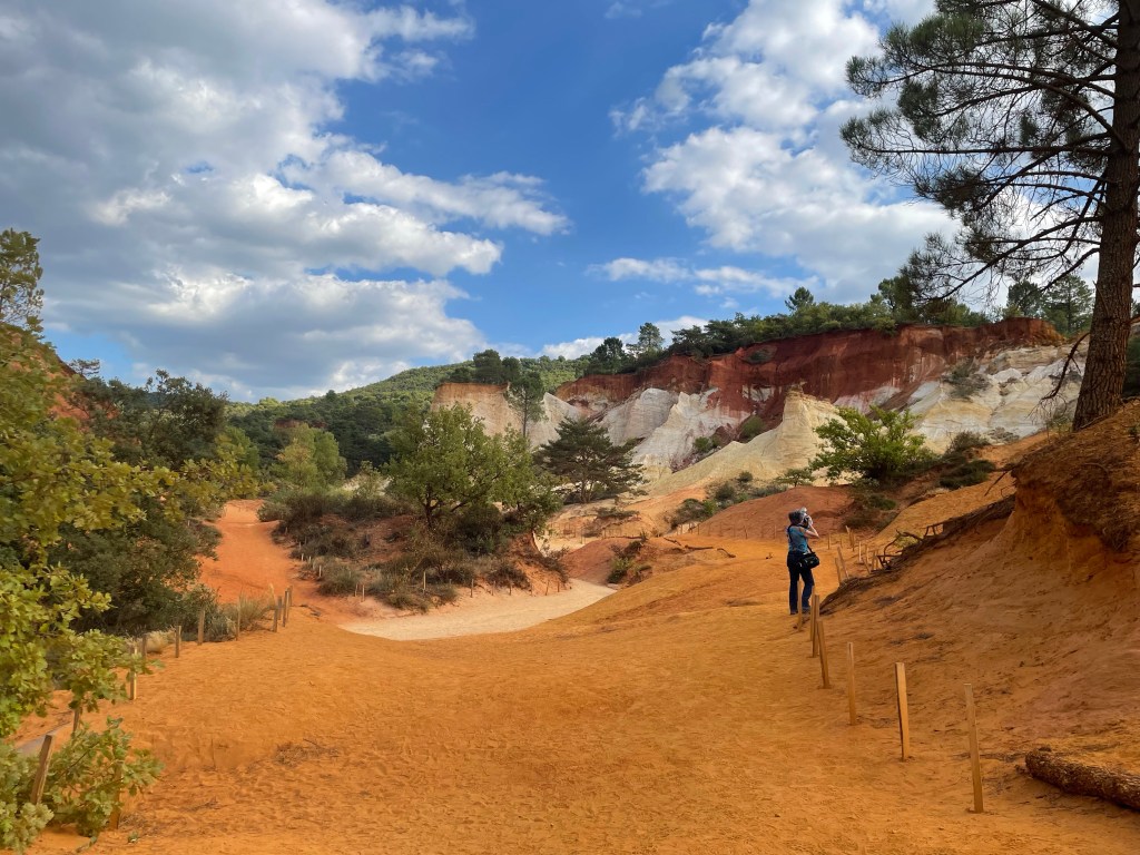 Pour la randonnée du Sentier des Ocres deux parcours sont proposés de 30 et 50 mn. Nous sommes époustouflés par les paysages spectaculaires qui s’offrent à nous dès le départ. L’ocre est partout, étalant ses variations de couleursnaturelles, ses paysages façonnés par l’eau, le vent et la main de l’homme. Pour ma part, j’ai abandonné mon mari pour rejoindre la grande boucle que j’ai parcourue pendant un long moment seule. Parvenue au sommet la vue sur le parc était incomparable. C’est ainsi qu’on voyage grâce à ces ocres du désert du Sahara au Grand Canyon américain, en passant par la Cappadoce turque.