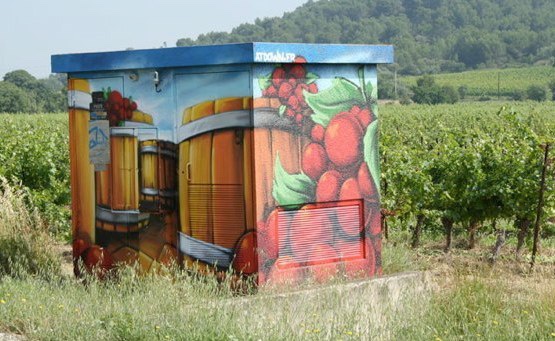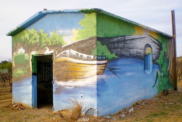 En partenariat avec l’agglo de Béziers, l’agence ATDOWN de Montpellier a développé la décoration des cabanes vigneronnes selon des thématiques liées au patrimoine régional (la vigne, le Canal du Midi, le rugby).